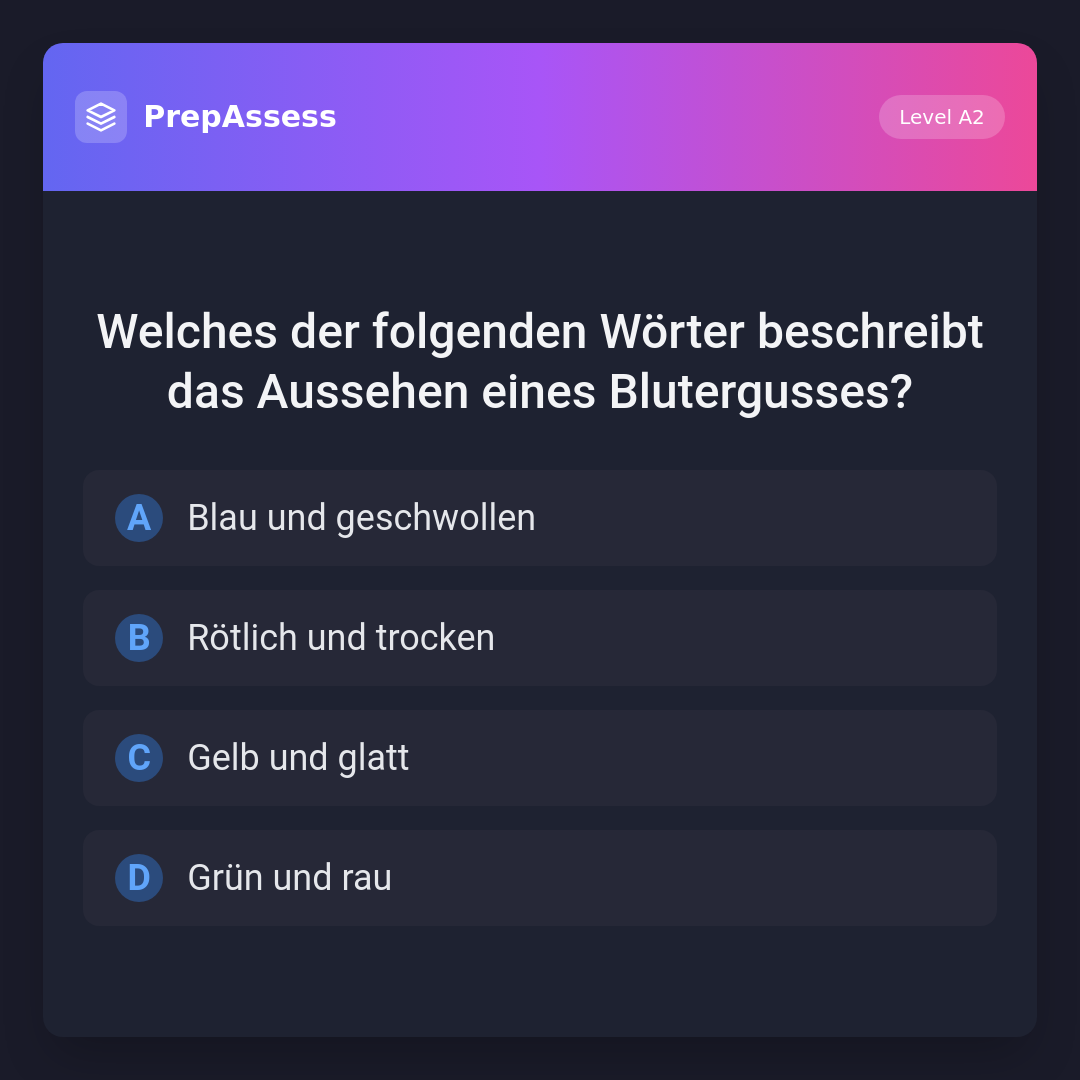 Welches der folgenden Wörter beschreibt das Aussehen eines Blutergusses?