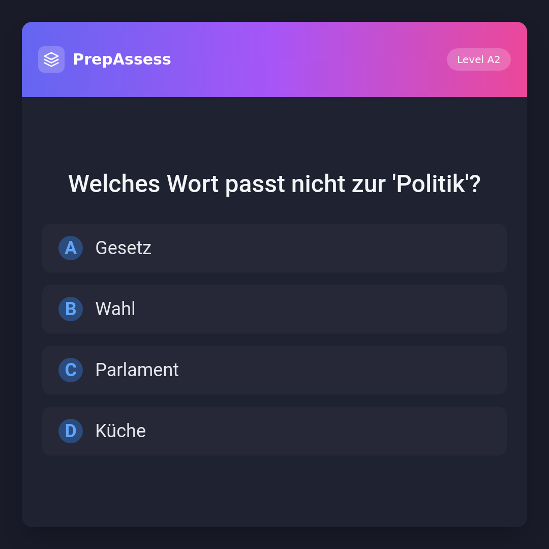 Die Wörter 'Gesetz', 'Wahl' und 'Parlament' haben alle mit der Politik zu tun, während 'Küche' ein Thema ist, das nicht zur Politik gehört.