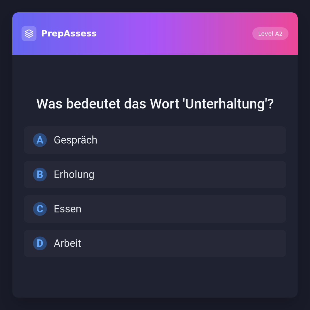 Das Wort 'Unterhaltung' bedeutet 'Gespräch'. Es kann sich auf ein Gespräch zwischen zwei oder mehr Personen beziehen. 'Erholung' bedeutet 'Entspannung', 'Essen' bezieht sich auf 'Nahrung' und 'Arbeit' ist das Gegenteil von Freizeit.