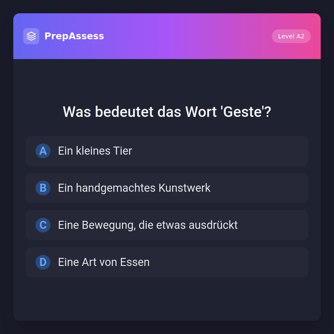 Die richtige Antwort ist 'c'. Eine 'Geste' ist eine Bewegung, die etwas ausdrückt oder kommuniziert. Die anderen Optionen beschreiben keine Gesten.