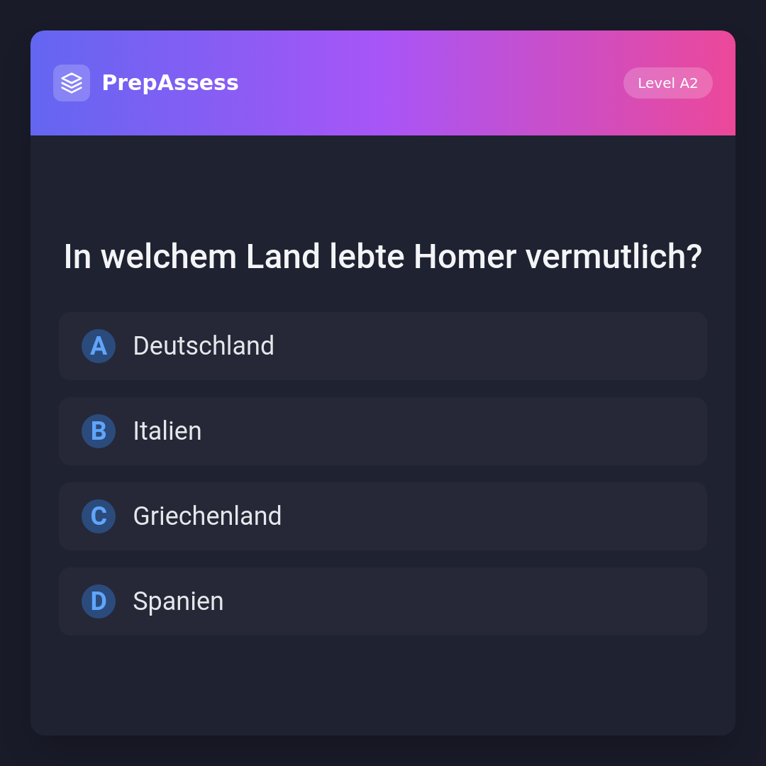 Homer wird mit dem antiken Griechenland in Verbindung gebracht. Er ist ein zentraler Bestandteil der griechischen Literatur und Geschichte. Die anderen Länder sind nicht mit Homer verbunden.