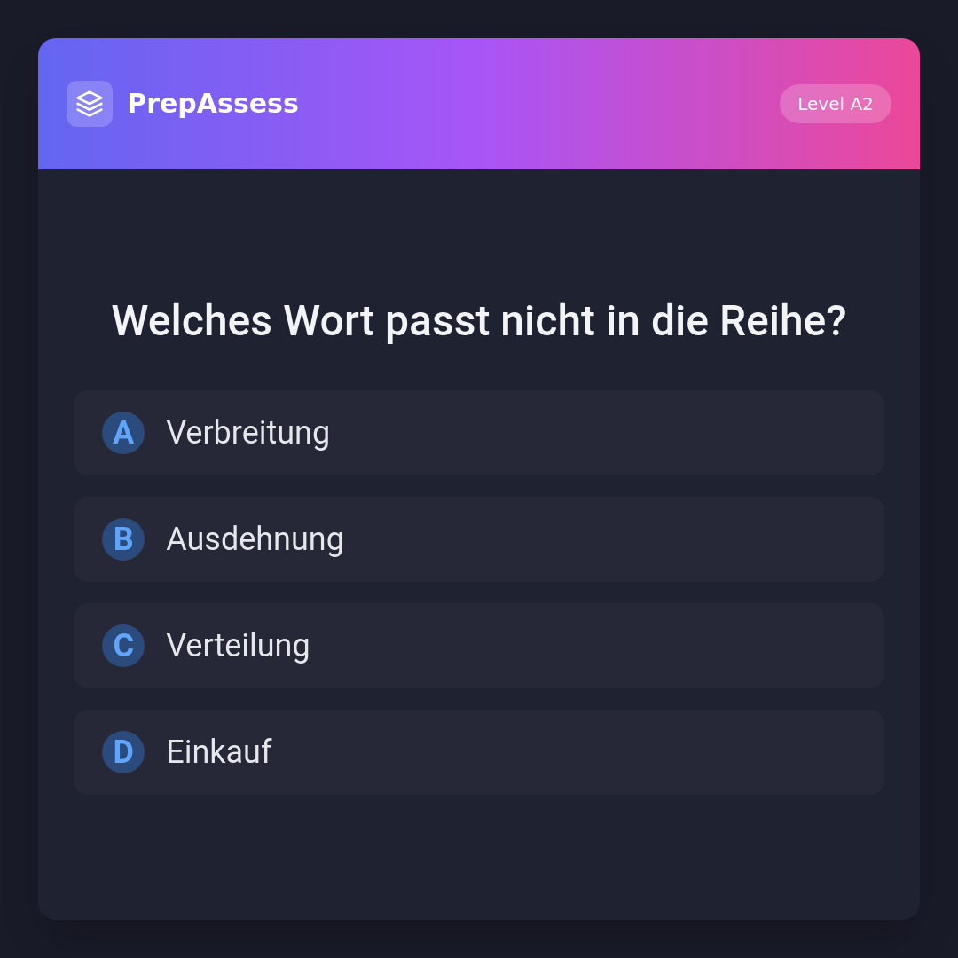 Die Wörter 'Verbreitung', 'Ausdehnung' und 'Verteilung' hängen alle mit dem Konzept der Ausbreitung oder Verteilung zusammen. 'Einkauf' hat damit nichts zu tun und passt deshalb nicht in die Reihe.