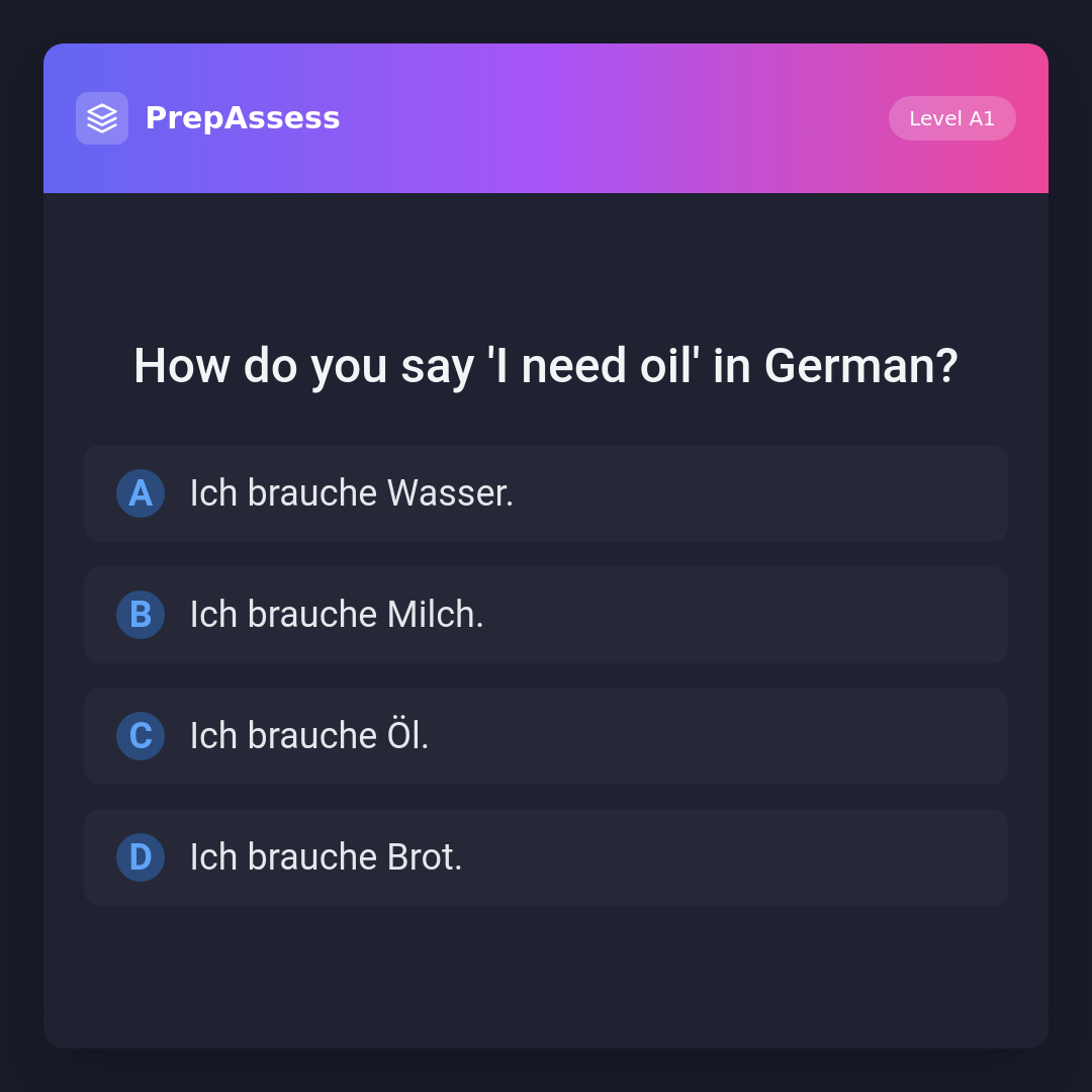 The correct translation is 'Ich brauche Öl.' 'Ich brauche Wasser.' means 'I need water.', 'Ich brauche Milch.' means 'I need milk.', and 'Ich brauche Brot.' means 'I need bread.'