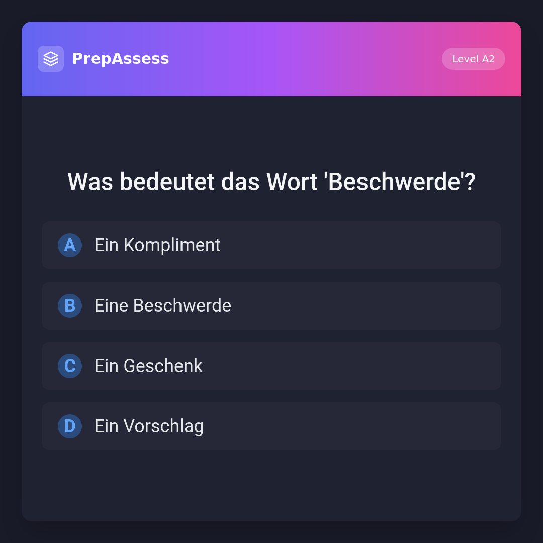 'Beschwerde' bedeutet eine Klage oder Reklamation über etwas. Es ist das Gegenteil von einem Kompliment (a), und es ist kein Geschenk (c) oder Vorschlag (d).