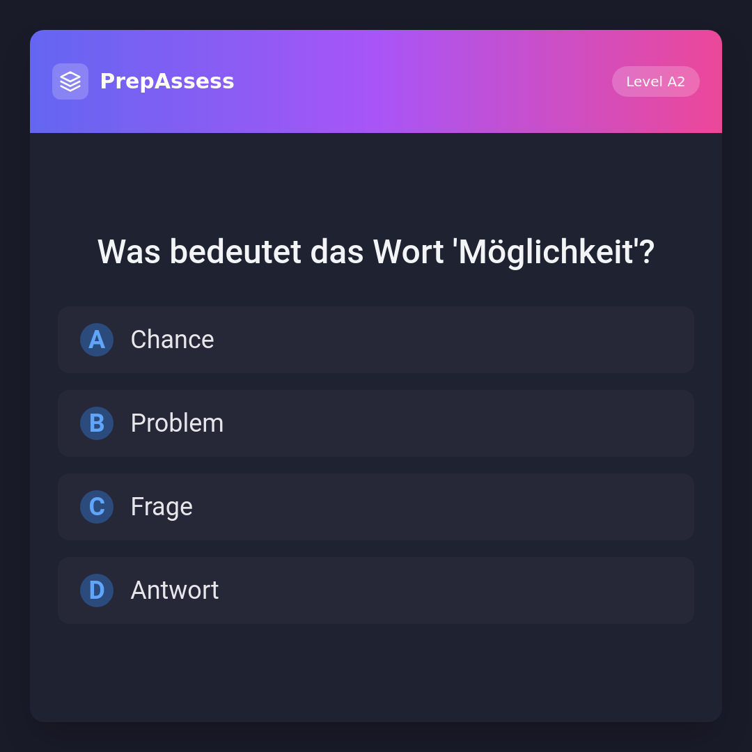 Das Wort 'Möglichkeit' bedeutet 'Chance' oder 'Gelegenheit'. Es bezeichnet eine Option oder eine Gelegenheit, etwas zu tun. 'Problem', 'Frage' und 'Antwort' haben andere Bedeutungen.
