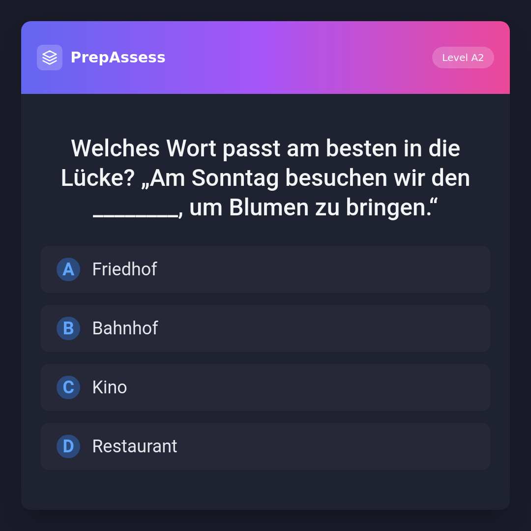 Welches Wort passt am besten in die Lücke? „Am Sonntag besuchen wir den ________, um Blumen zu bringen.“