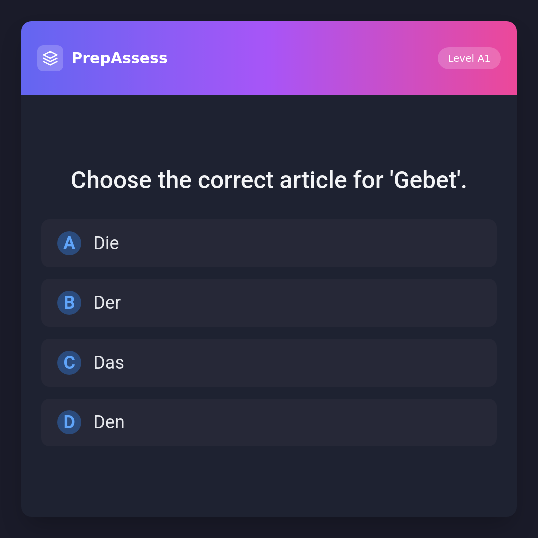 The correct article for 'Gebet' is 'das'. In German, 'das' is used for neuter nouns, and 'Gebet' is neuter. 'Die' is for feminine nouns, 'Der' is for masculine nouns, and 'Den' is an accusative form.