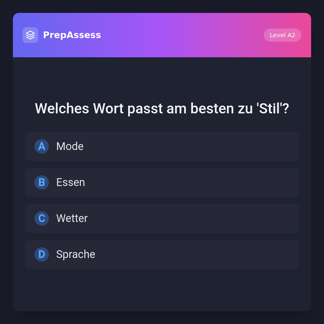 'Stil' wird oft in Verbindung mit 'Mode' verwendet, da es sich auf Kleidung und Design bezieht. 'Essen', 'Wetter' und 'Sprache' sind andere Themen, die nicht direkt mit 'Stil' assoziiert werden.