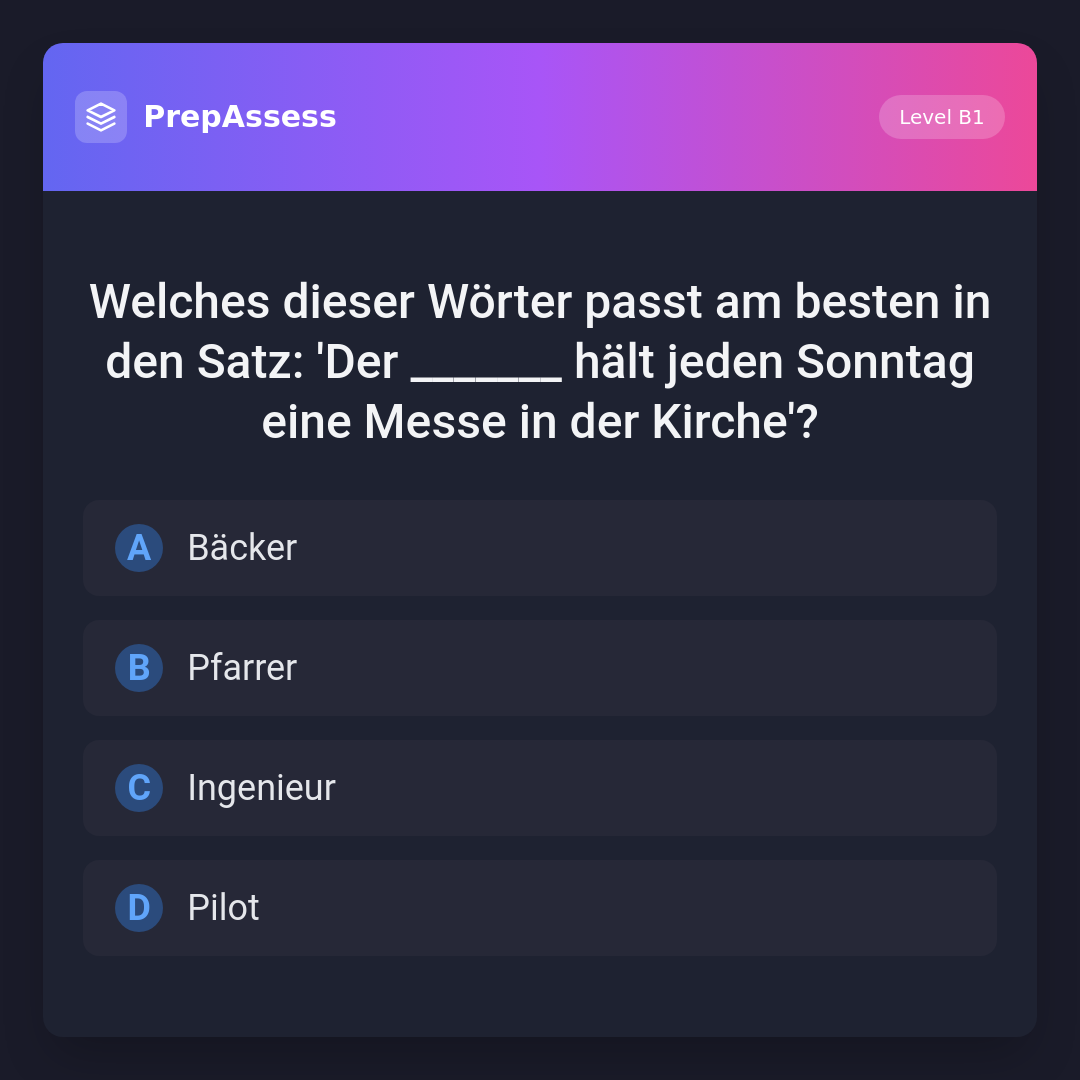 Welches dieser Wörter passt am besten in den Satz: 'Der _______ hält jeden Sonntag eine Messe in der Kirche'?