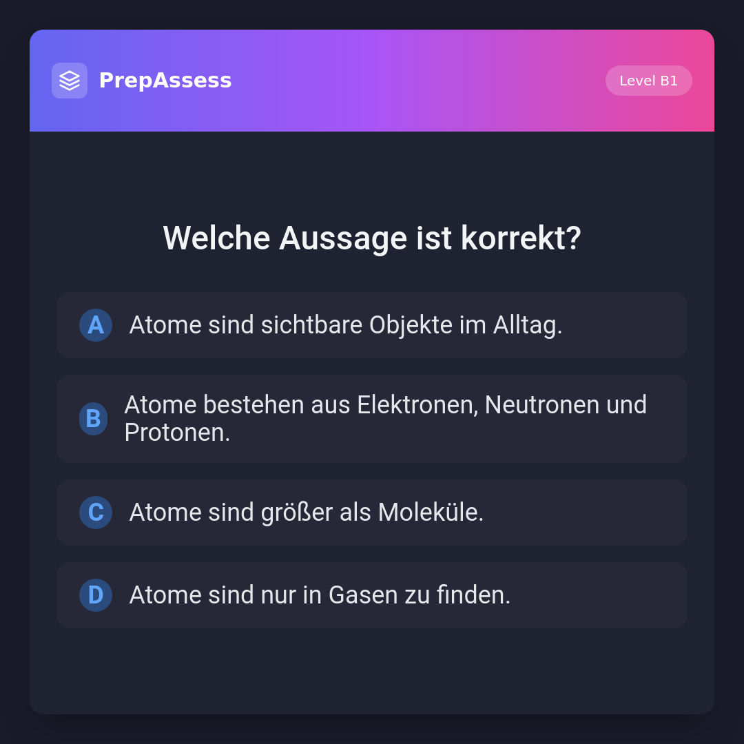 Atome sind die Bausteine der Materie und bestehen aus Elektronen, Neutronen und Protonen. Sie sind nicht sichtbar im Alltag, kleiner als Moleküle und finden sich in allen Aggregatzuständen, nicht nur in Gasen.