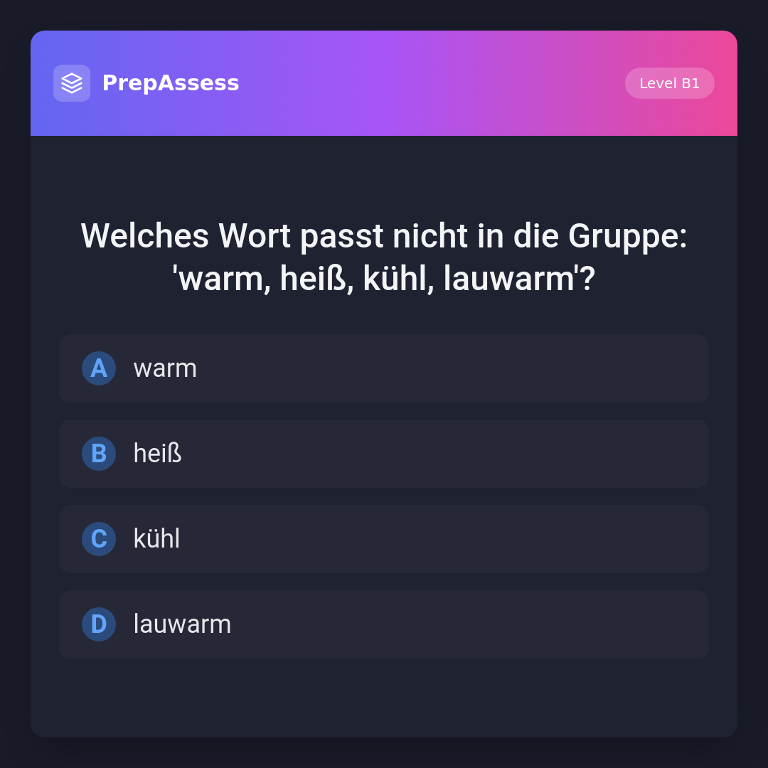 Welches Wort passt nicht in die Gruppe: 'warm, heiß, kühl, lauwarm'?