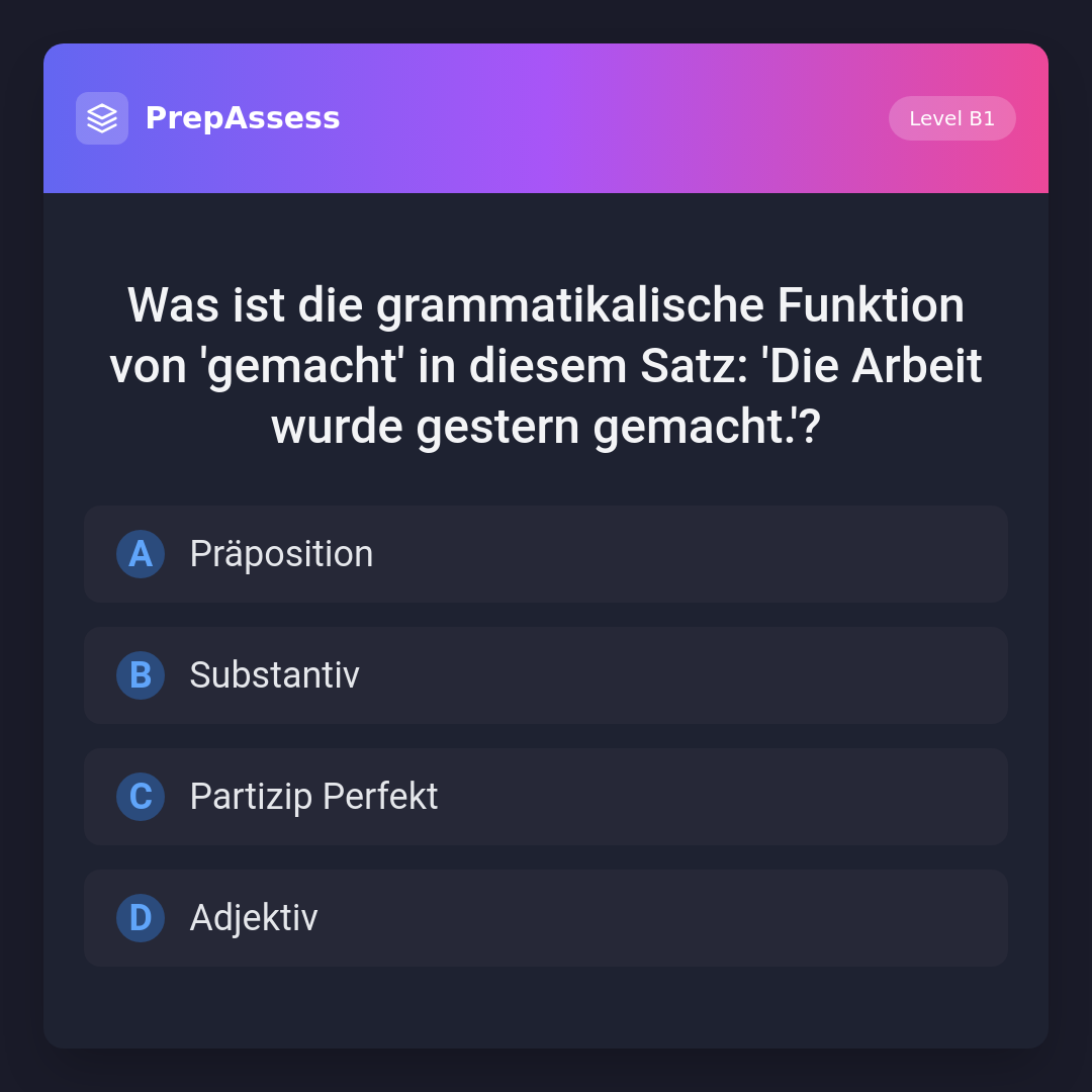 Was ist die grammatikalische Funktion von 'gemacht' in diesem Satz: 'Die Arbeit wurde gestern gemacht.'?