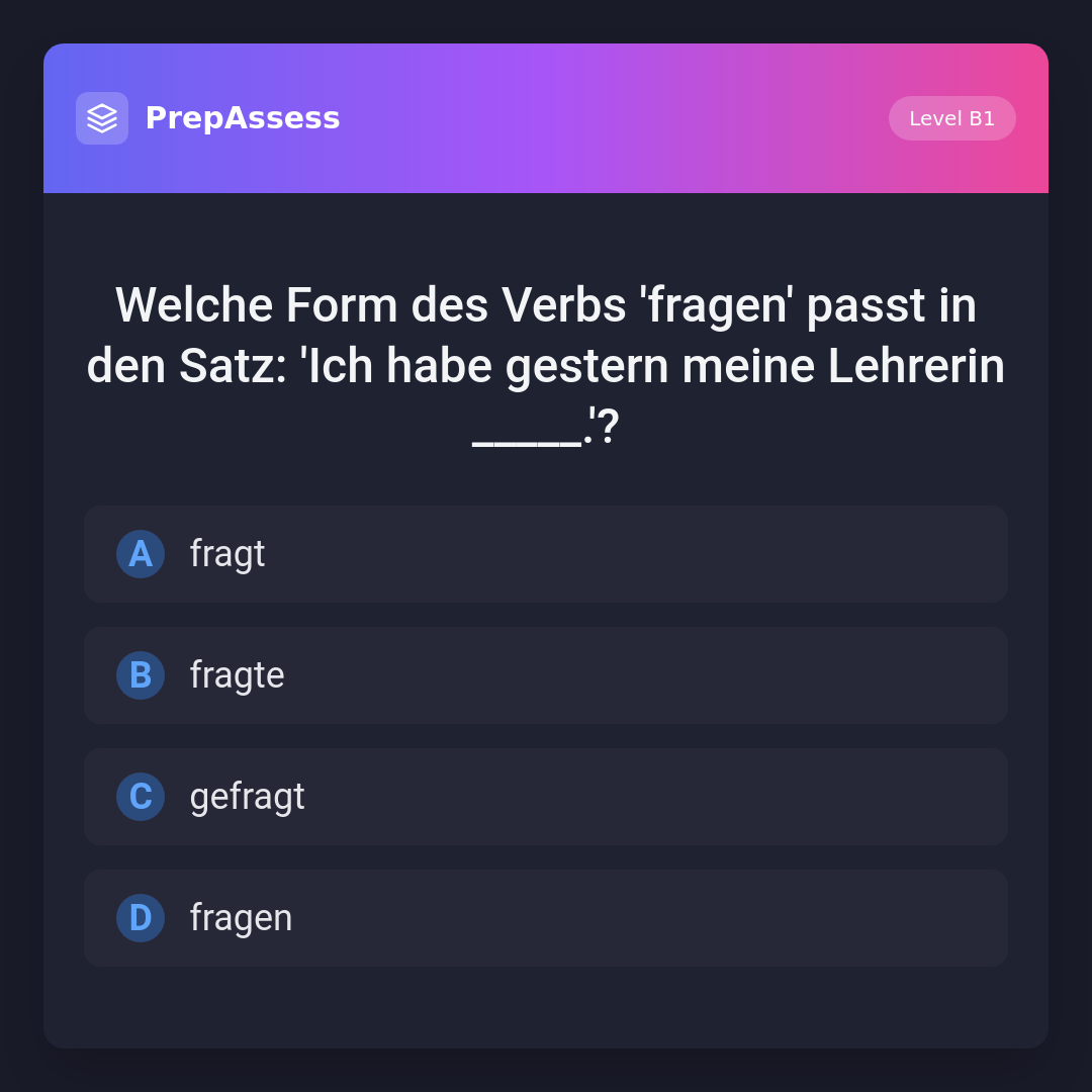 Welche Form des Verbs 'fragen' passt in den Satz: 'Ich habe gestern meine Lehrerin _____.'?