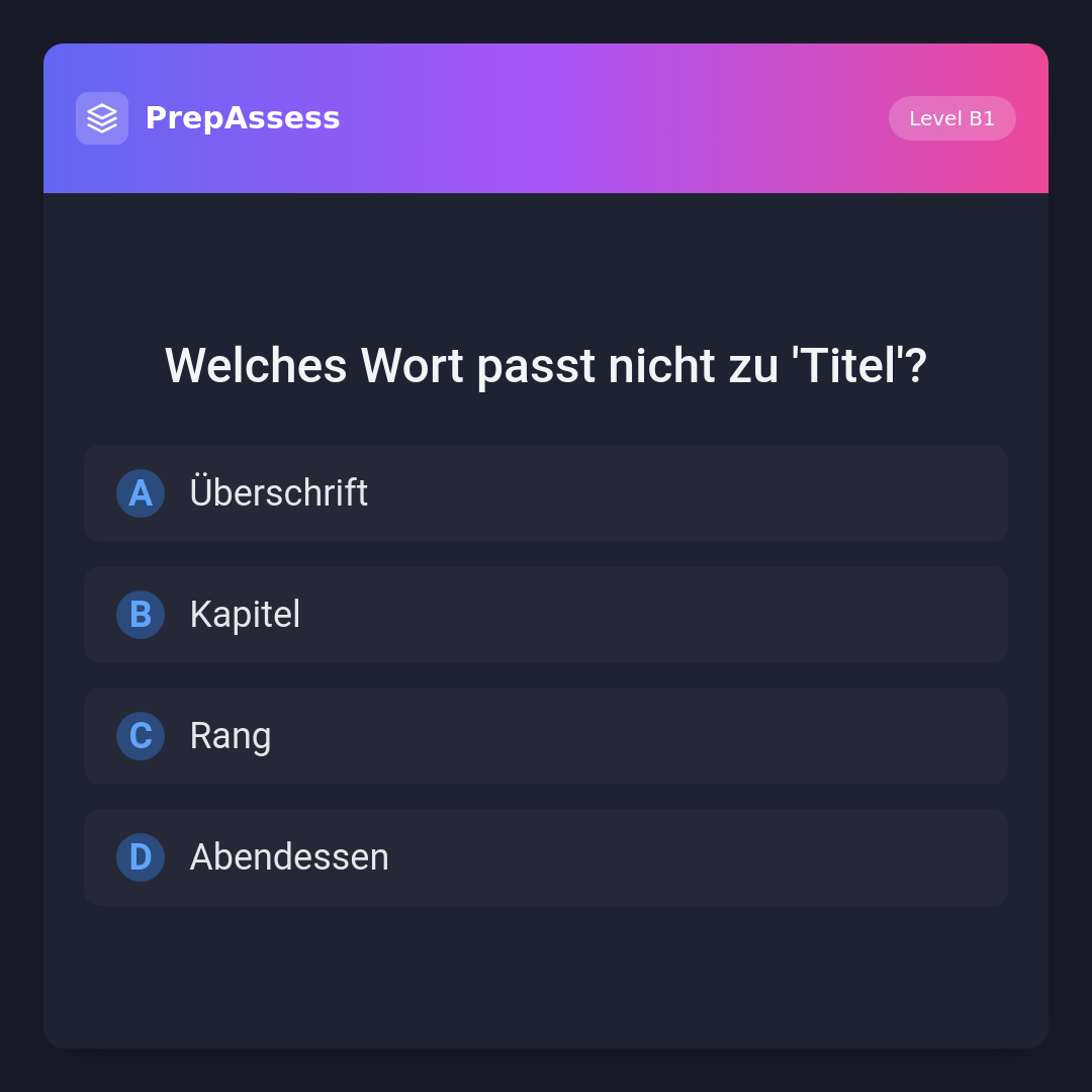 'Überschrift' und 'Kapitel' beziehen sich auf Texte, und 'Rang' kann im Kontext von Ehrungen oder Positionen verwendet werden. 'Abendessen' ist jedoch kein verwandter Begriff zu 'Titel'.