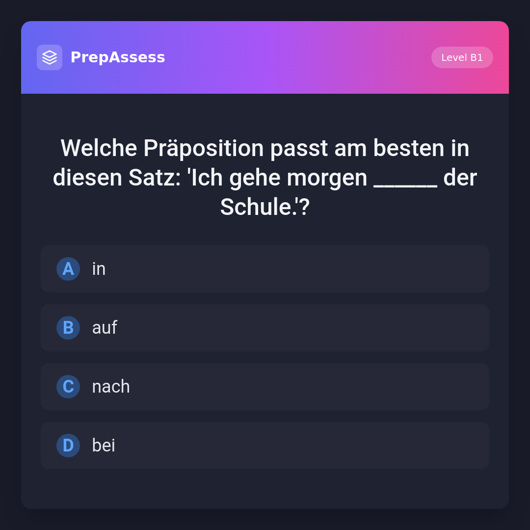 Welche Präposition passt am besten in diesen Satz: 'Ich gehe morgen ______ der Schule.'?