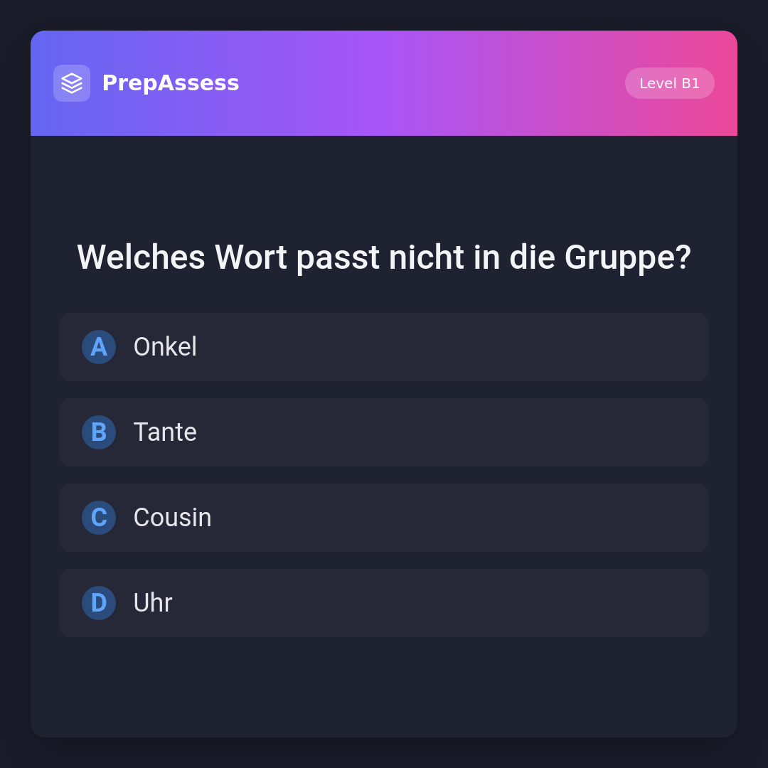 Das Wort 'Uhr' passt nicht in die Gruppe, da es sich um einen Gegenstand handelt und nicht um ein Familienmitglied. Die anderen Begriffe 'Onkel', 'Tante' und 'Cousin' beziehen sich auf Familienmitglieder.