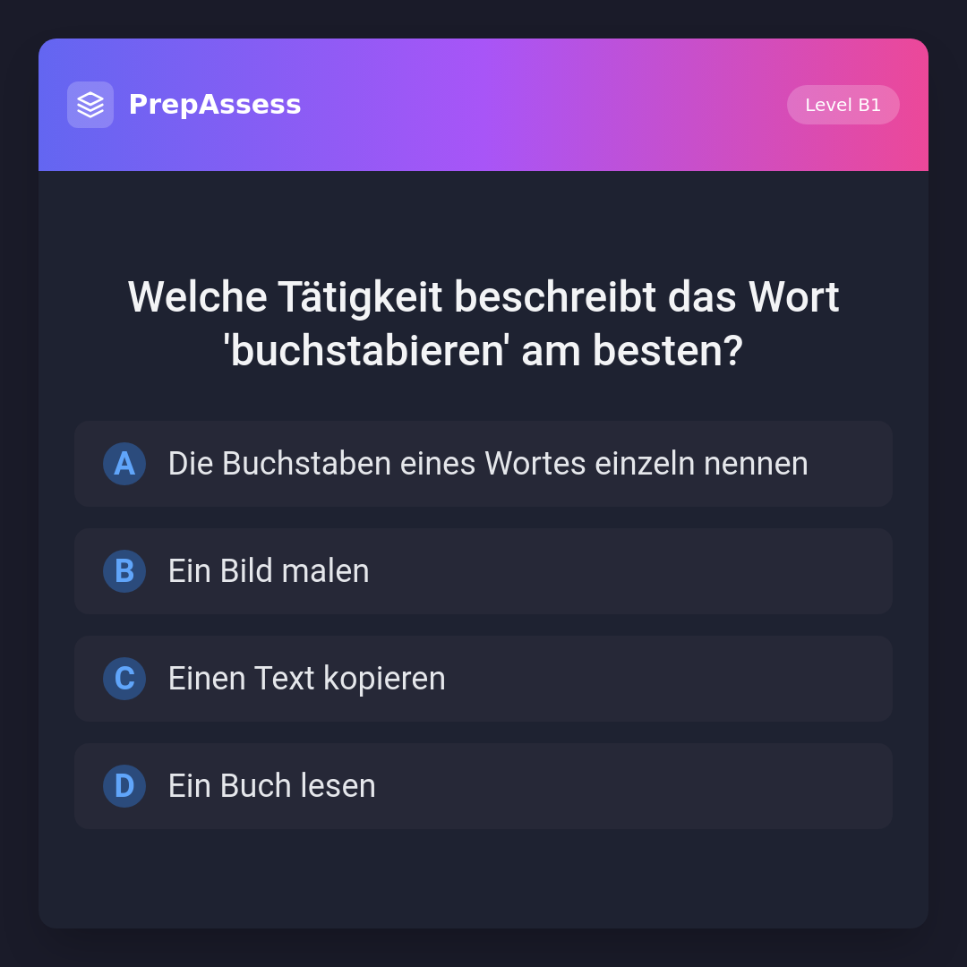 Welche Tätigkeit beschreibt das Wort 'buchstabieren' am besten?