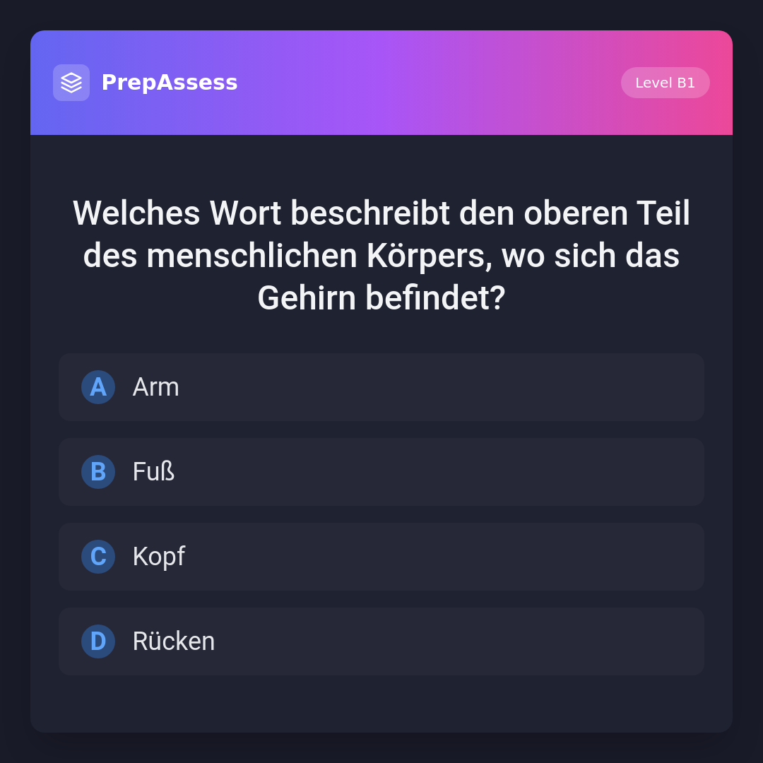 Welches Wort beschreibt den oberen Teil des menschlichen Körpers, wo sich das Gehirn befindet?