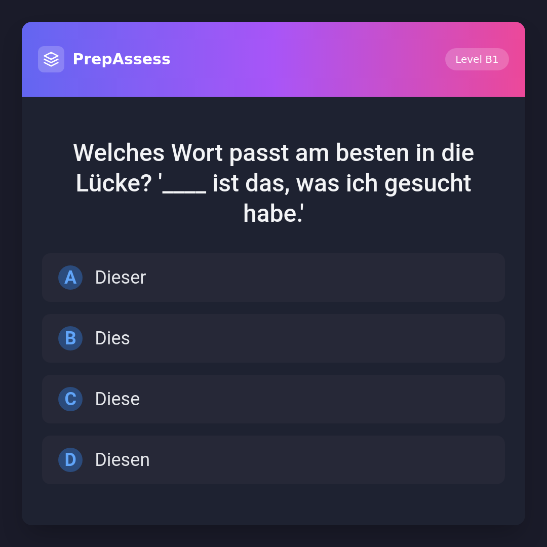 Welches Wort passt am besten in die Lücke? '____ ist das, was ich gesucht habe.'