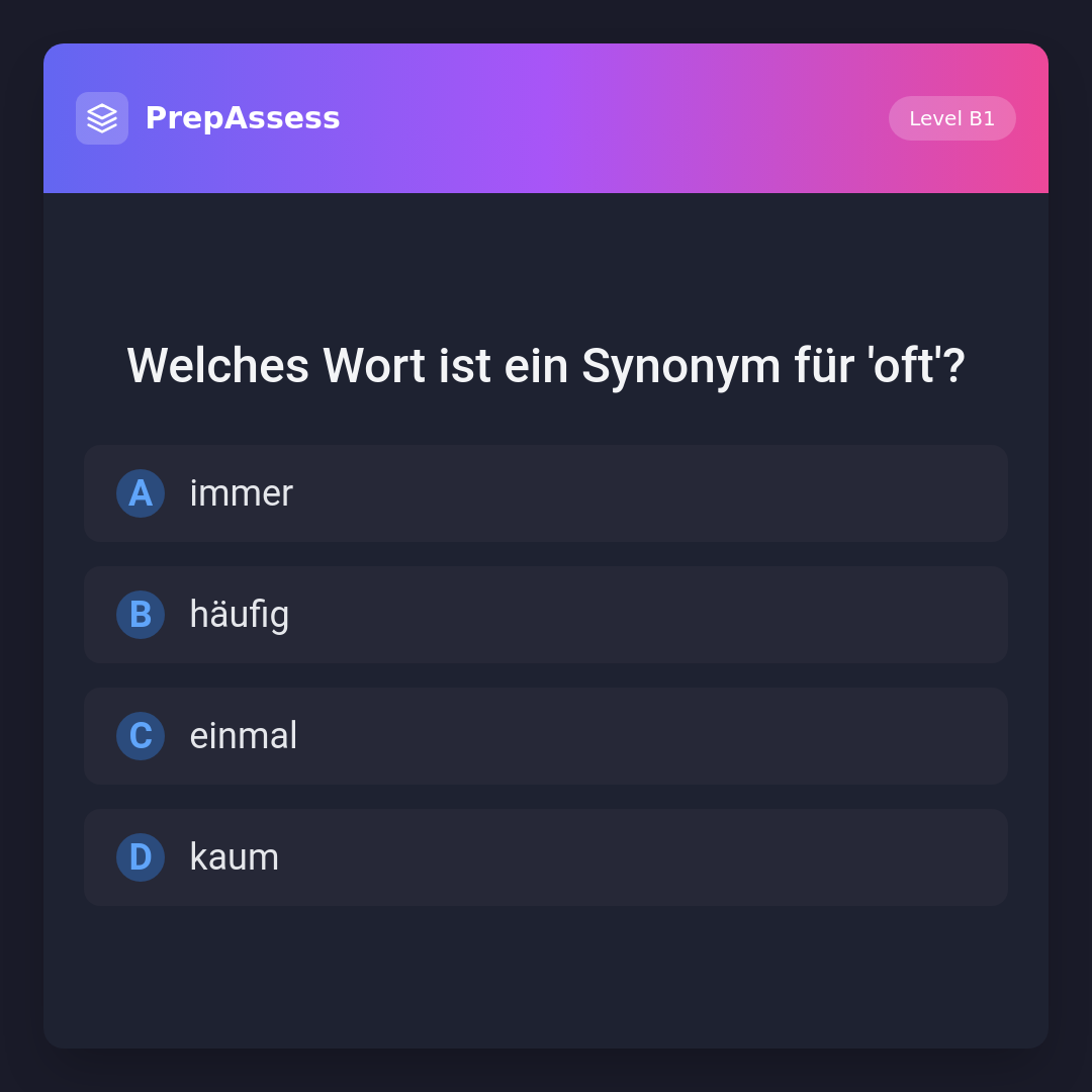 Das Wort 'häufig' ist ein Synonym für 'oft' und bedeutet ebenfalls 'frequently'. 'Immer' bedeutet 'always', 'einmal' bedeutet 'once', und 'kaum' bedeutet 'hardly'.