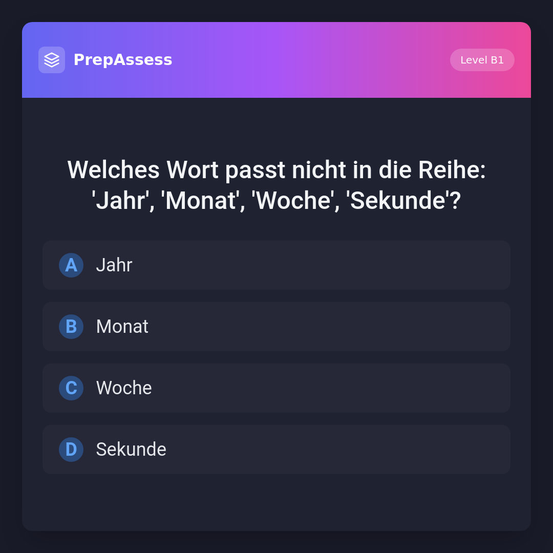 Welches Wort passt nicht in die Reihe: 'Jahr', 'Monat', 'Woche', 'Sekunde'?