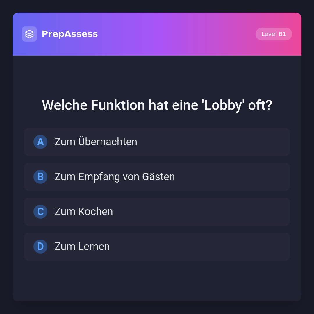 Eine Lobby dient oft dem Empfang von Gästen, was ihre primäre Funktion in Hotels und Bürogebäuden ist. Übernachten, Kochen und Lernen sind Aktivitäten, die normalerweise in anderen Räumen stattfinden.