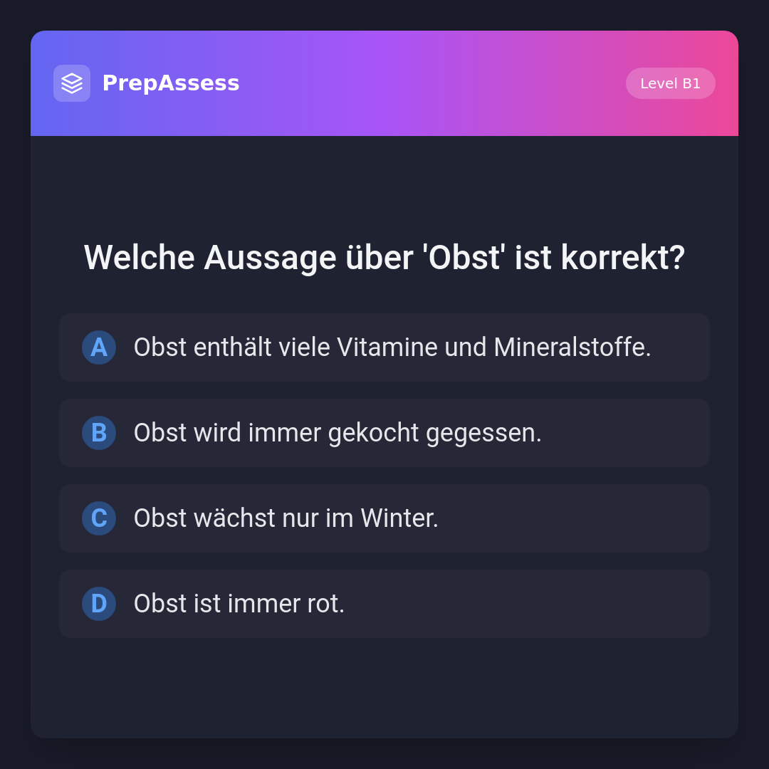 Obst ist bekannt dafür, viele Vitamine und Mineralstoffe zu enthalten. Es wird nicht immer gekocht gegessen (b) und wächst nicht nur im Winter (c). Obst kann verschiedene Farben haben und ist nicht immer rot (d).