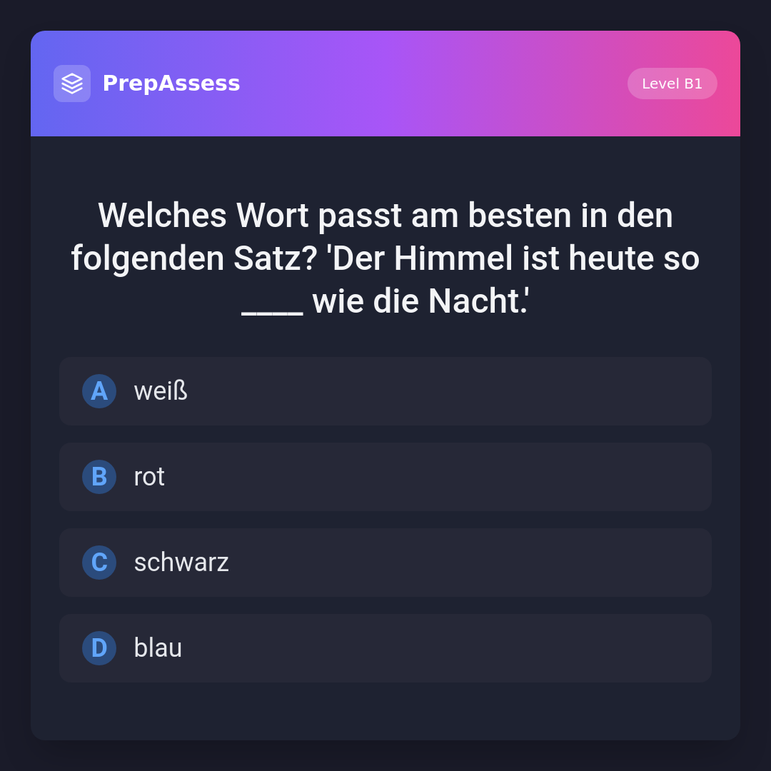 Welches Wort passt am besten in den folgenden Satz? 'Der Himmel ist heute so ____ wie die Nacht.'