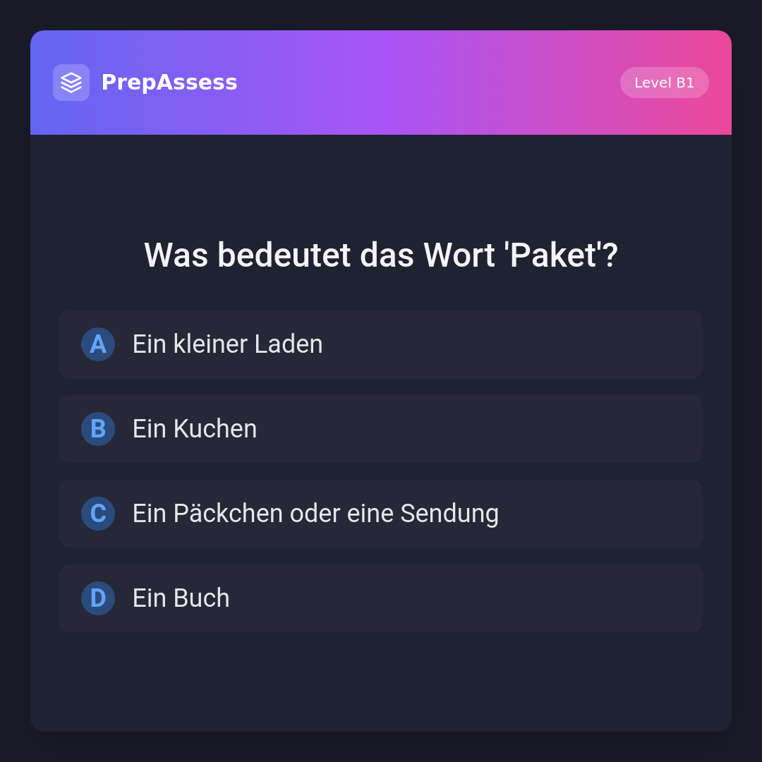 Das Wort 'Paket' bedeutet 'ein Päckchen oder eine Sendung'. Es bezeichnet ein größeres Paket als ein Brief oder Päckchen. Die anderen Optionen beziehen sich auf andere Begriffe.