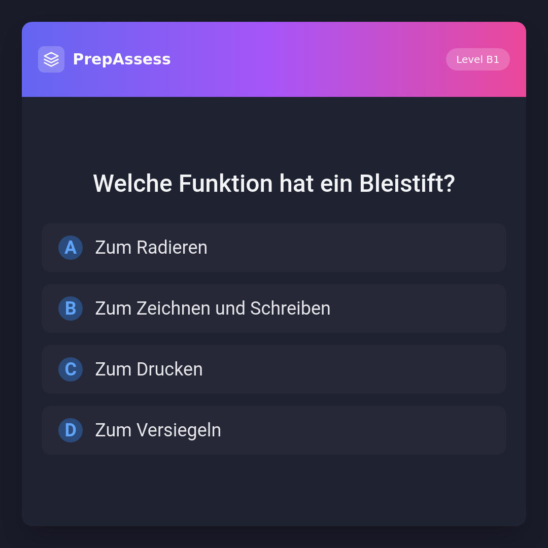 Ein Bleistift wird hauptsächlich zum Zeichnen und Schreiben verwendet. 'Zum Radieren' wäre die Funktion eines Radiergummis, 'Zum Drucken' gehört zu einem Drucker und 'Zum Versiegeln' ist nicht relevant für einen Bleistift.