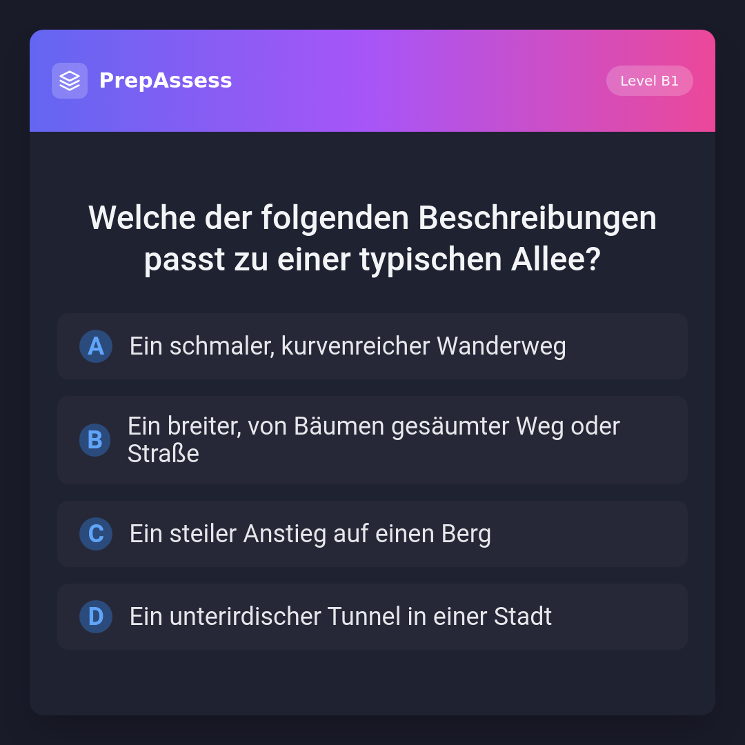 Welche der folgenden Beschreibungen passt zu einer typischen Allee?