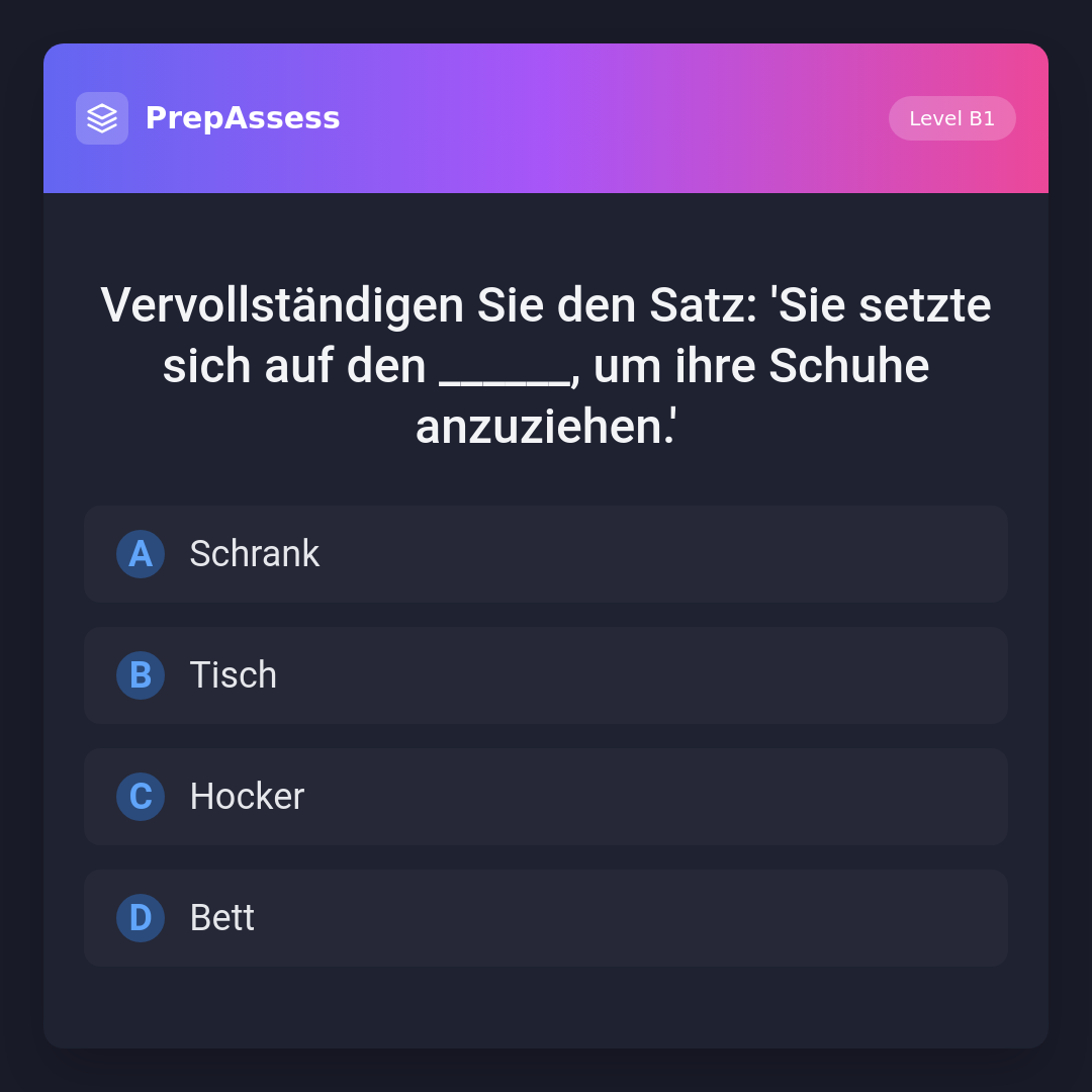 Vervollständigen Sie den Satz: 'Sie setzte sich auf den ______, um ihre Schuhe anzuziehen.'
