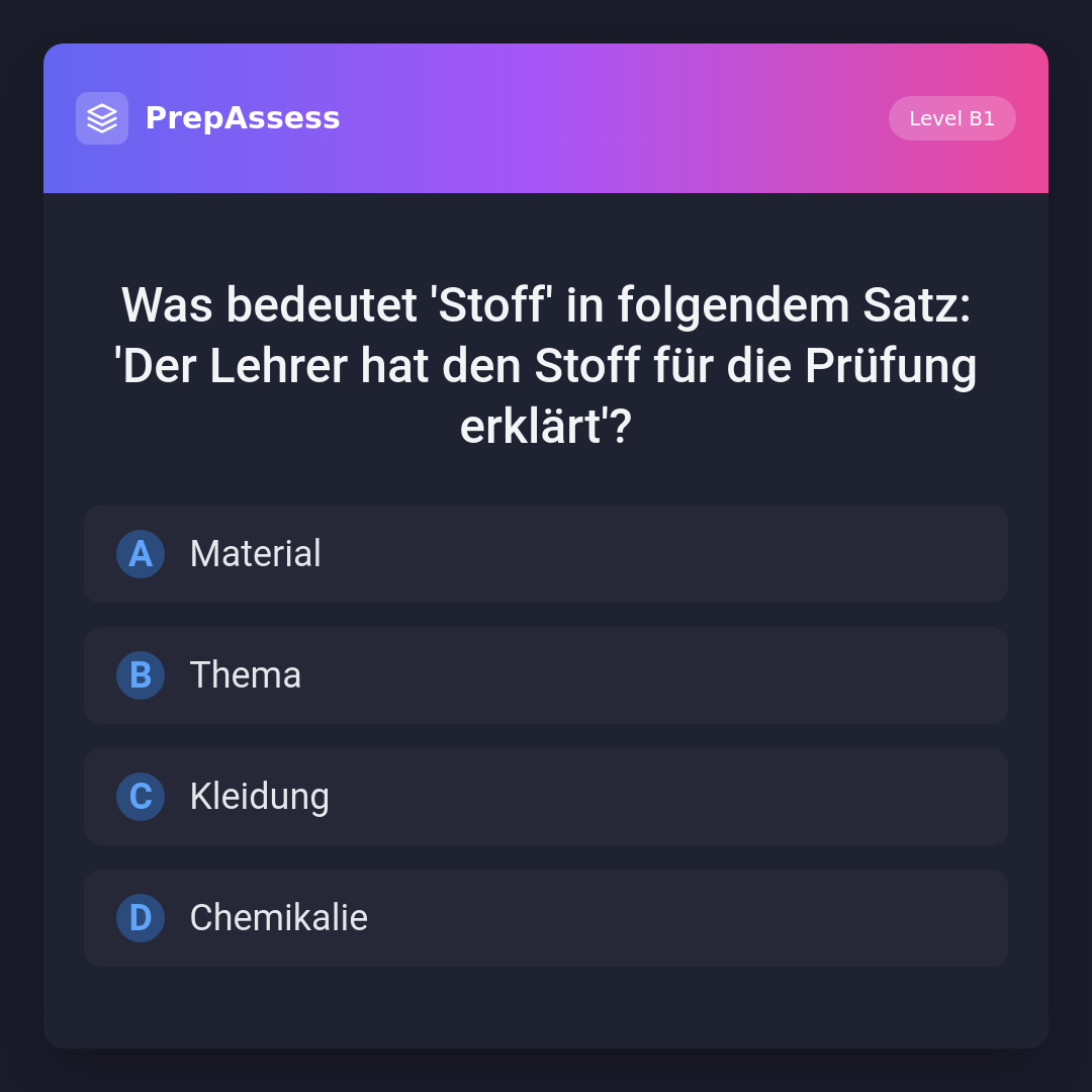 Was bedeutet 'Stoff' in folgendem Satz: 'Der Lehrer hat den Stoff für die Prüfung erklärt'?