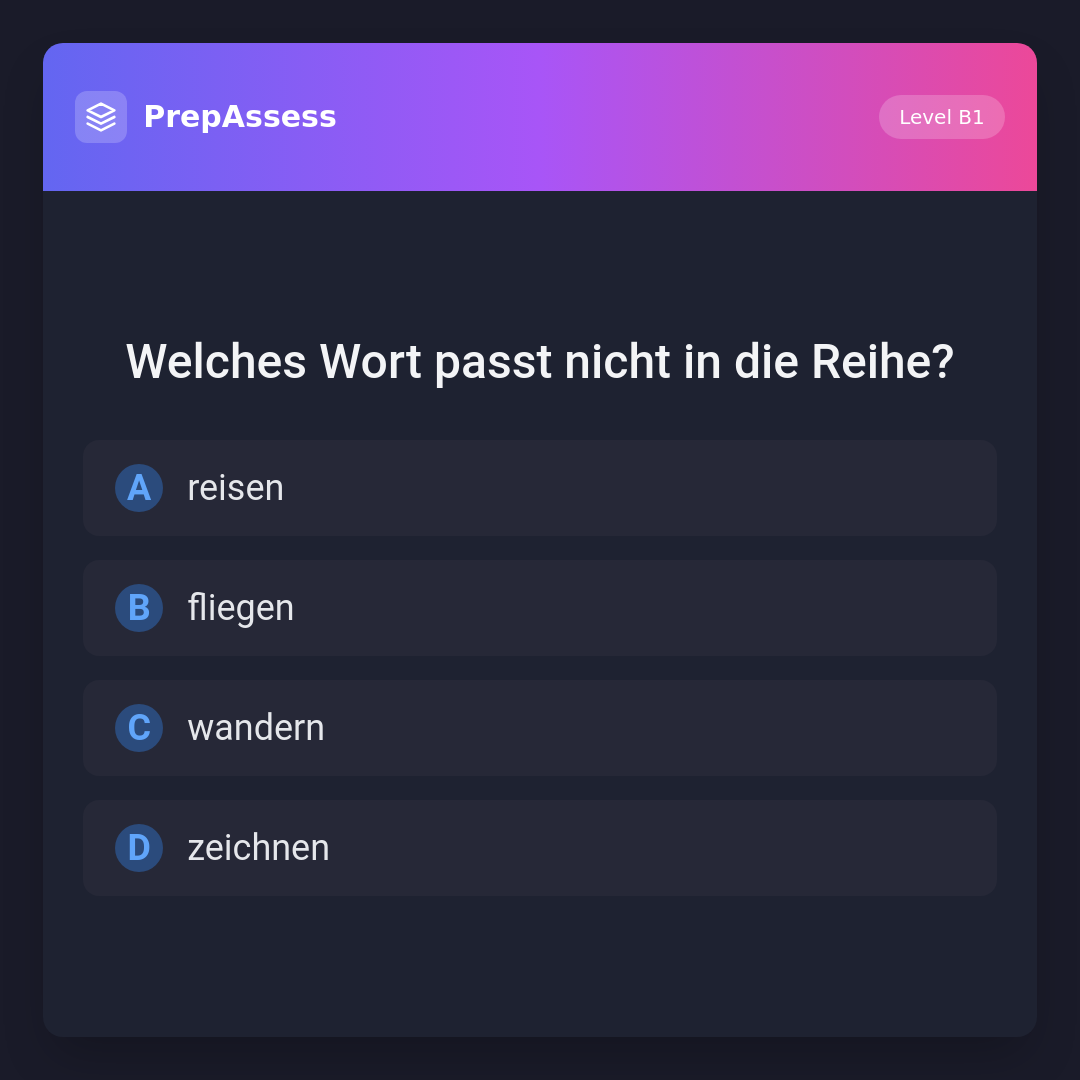 Die Wörter 'reisen', 'fliegen' und 'wandern' beziehen sich alle auf Fortbewegung oder Reisen. 'Zeichnen' hingegen ist eine kreative Tätigkeit und gehört nicht in diese Gruppe.
