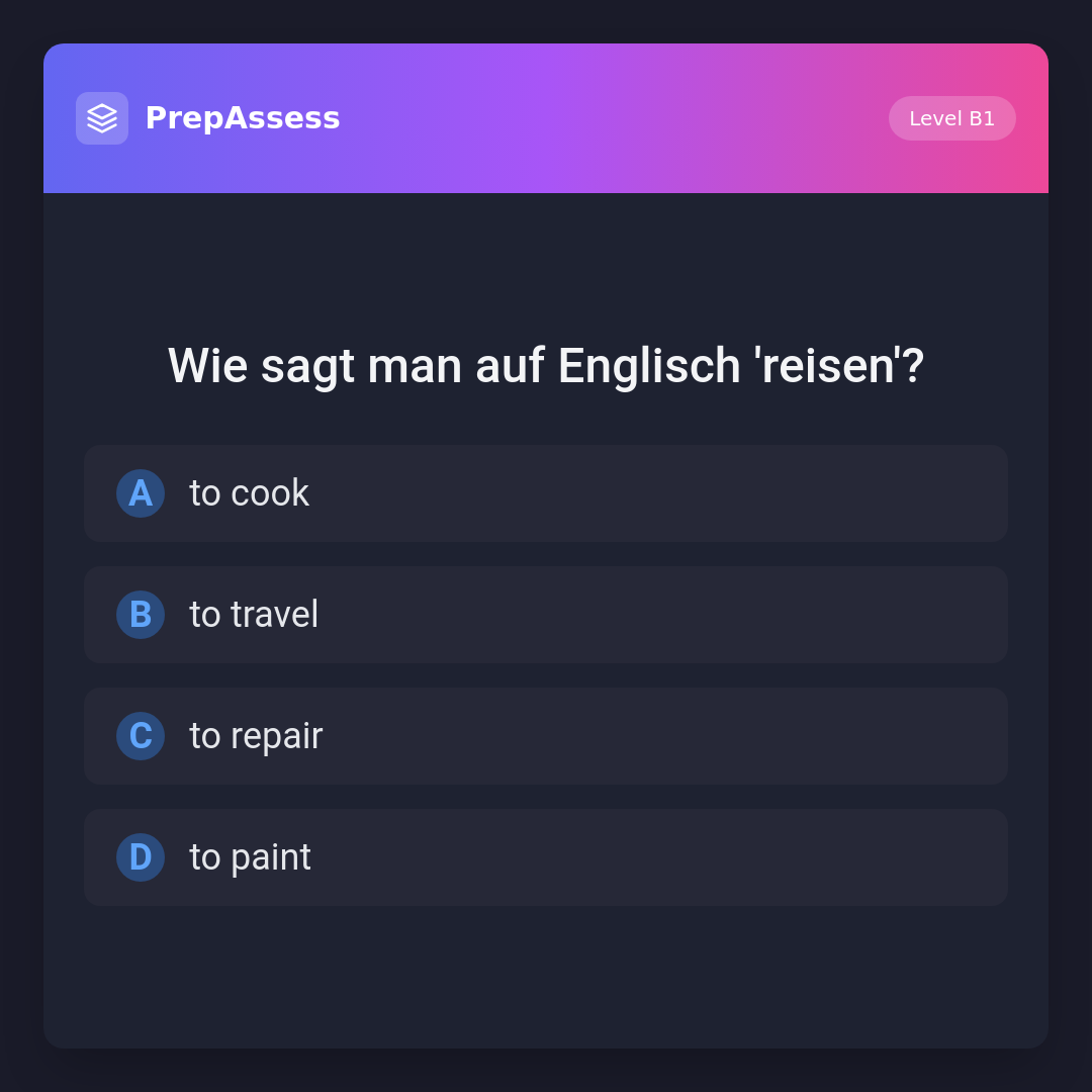 Das deutsche Verb 'reisen' wird auf Englisch mit 'to travel' übersetzt. Die anderen Optionen beziehen sich auf andere Tätigkeiten: 'to cook' (kochen), 'to repair' (reparieren), 'to paint' (malen).