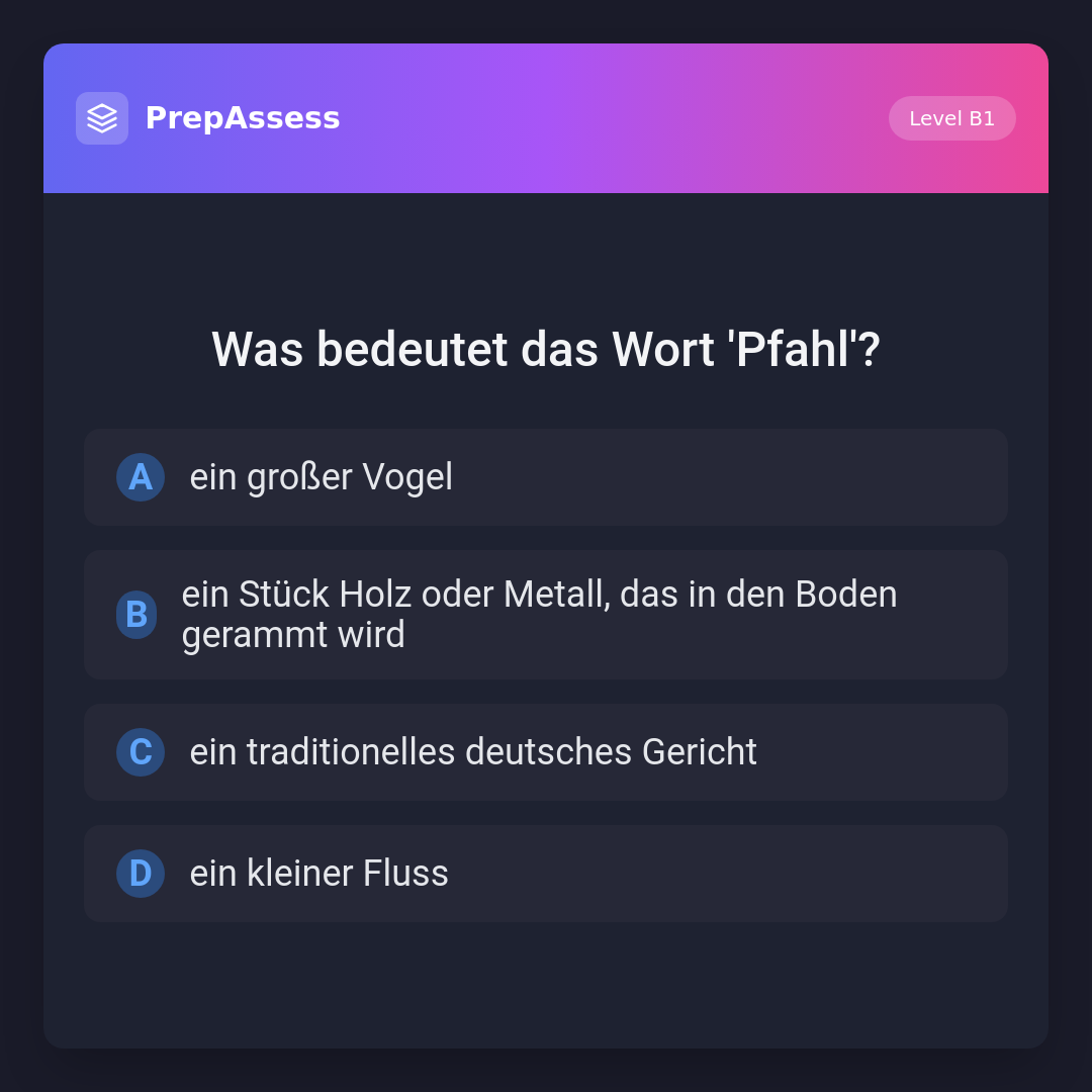 'Pfahl' bedeutet ein Stück Holz oder Metall, das in den Boden gerammt wird, um etwas zu befestigen oder zu markieren. Die anderen Optionen sind falsch: 'ein großer Vogel' wäre z.B. 'Adler', 'ein traditionelles deutsches Gericht' könnte ein 'Schnitzel' sein und 'ein kleiner Fluss' wäre ein 'Bach'.