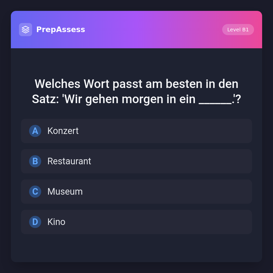 Welches Wort passt am besten in den Satz: 'Wir gehen morgen in ein ______.'?