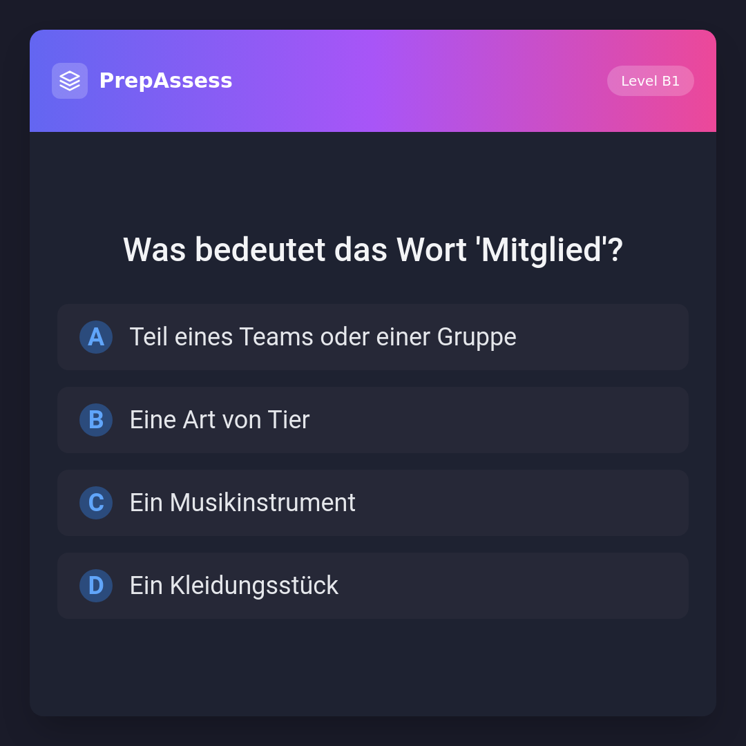 Das Wort 'Mitglied' bedeutet eine Person, die Teil eines Teams oder einer Gruppe ist. Die anderen Optionen beziehen sich auf Dinge, die keine Zugehörigkeit zu einer Gruppe beschreiben.