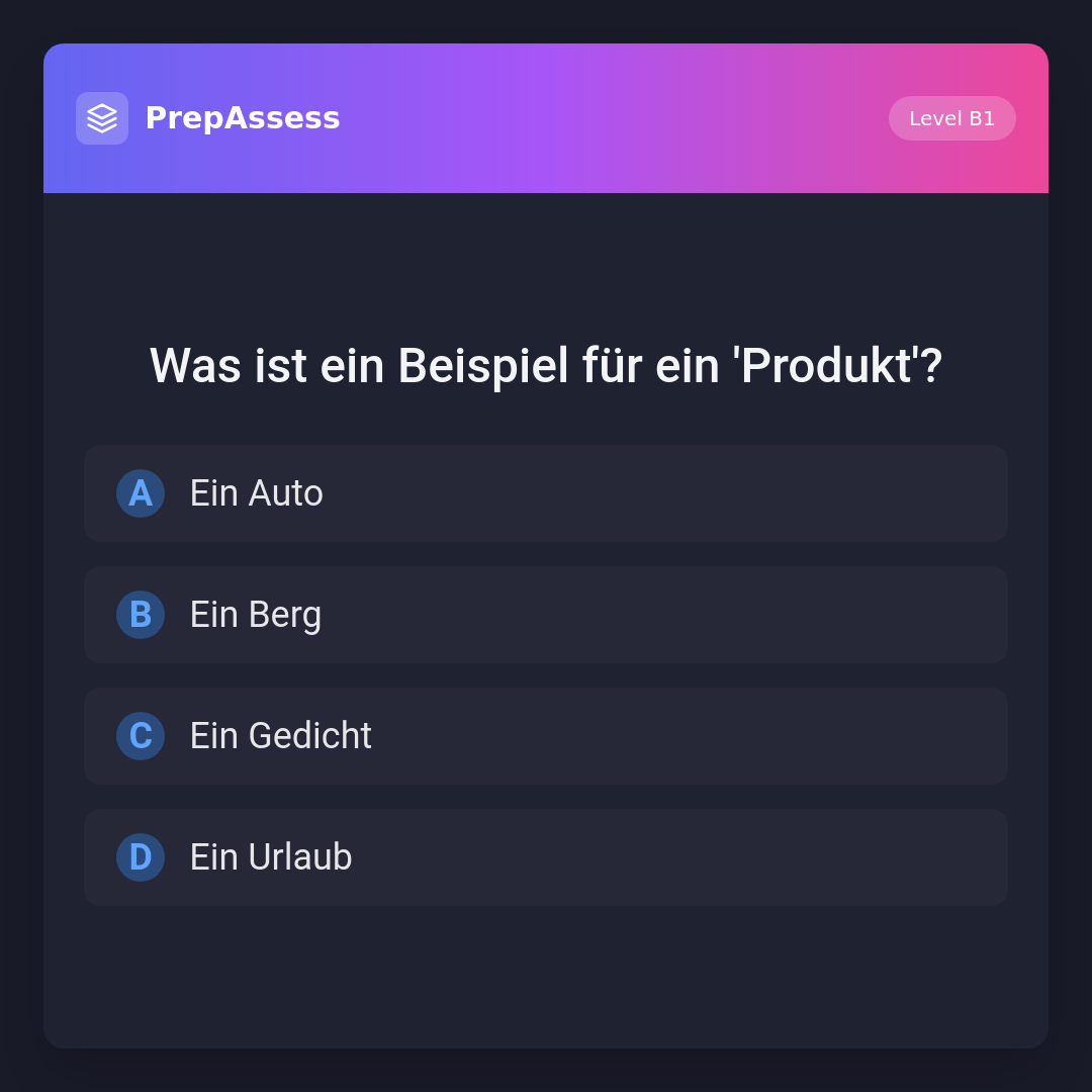 Ein Auto ist ein typisches Produkt, da es hergestellt und verkauft wird. Ein Berg ist ein natürliches Gebilde, ein Gedicht ist eine kreative Arbeit, und ein Urlaub ist eine Tätigkeit oder Erfahrung, keine physischen Produkte.