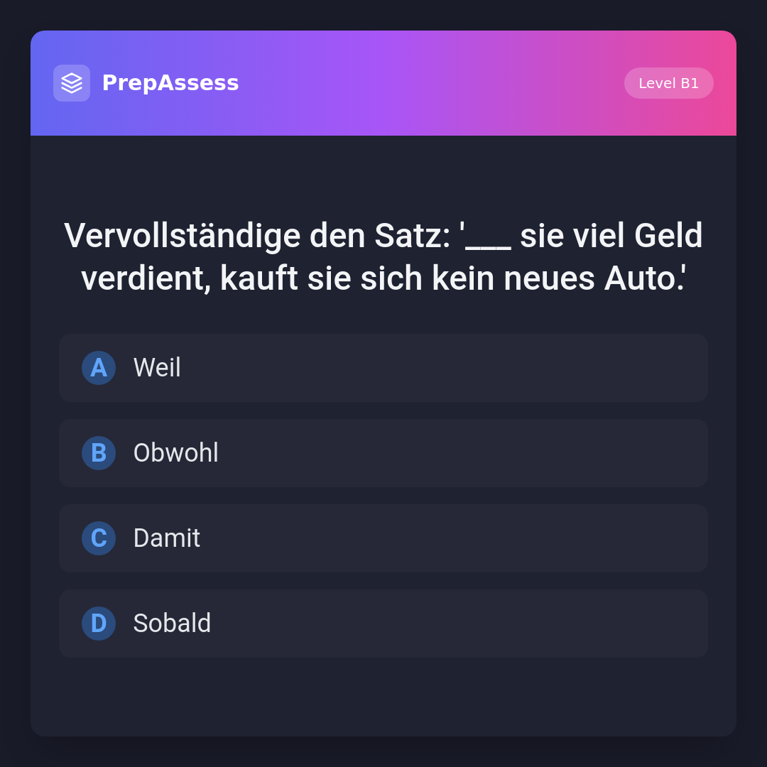 Vervollständige den Satz: '___ sie viel Geld verdient, kauft sie sich kein neues Auto.'