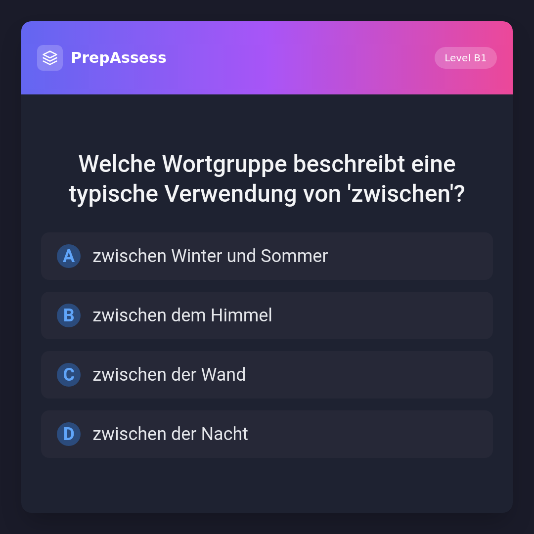 Welche Wortgruppe beschreibt eine typische Verwendung von 'zwischen'?