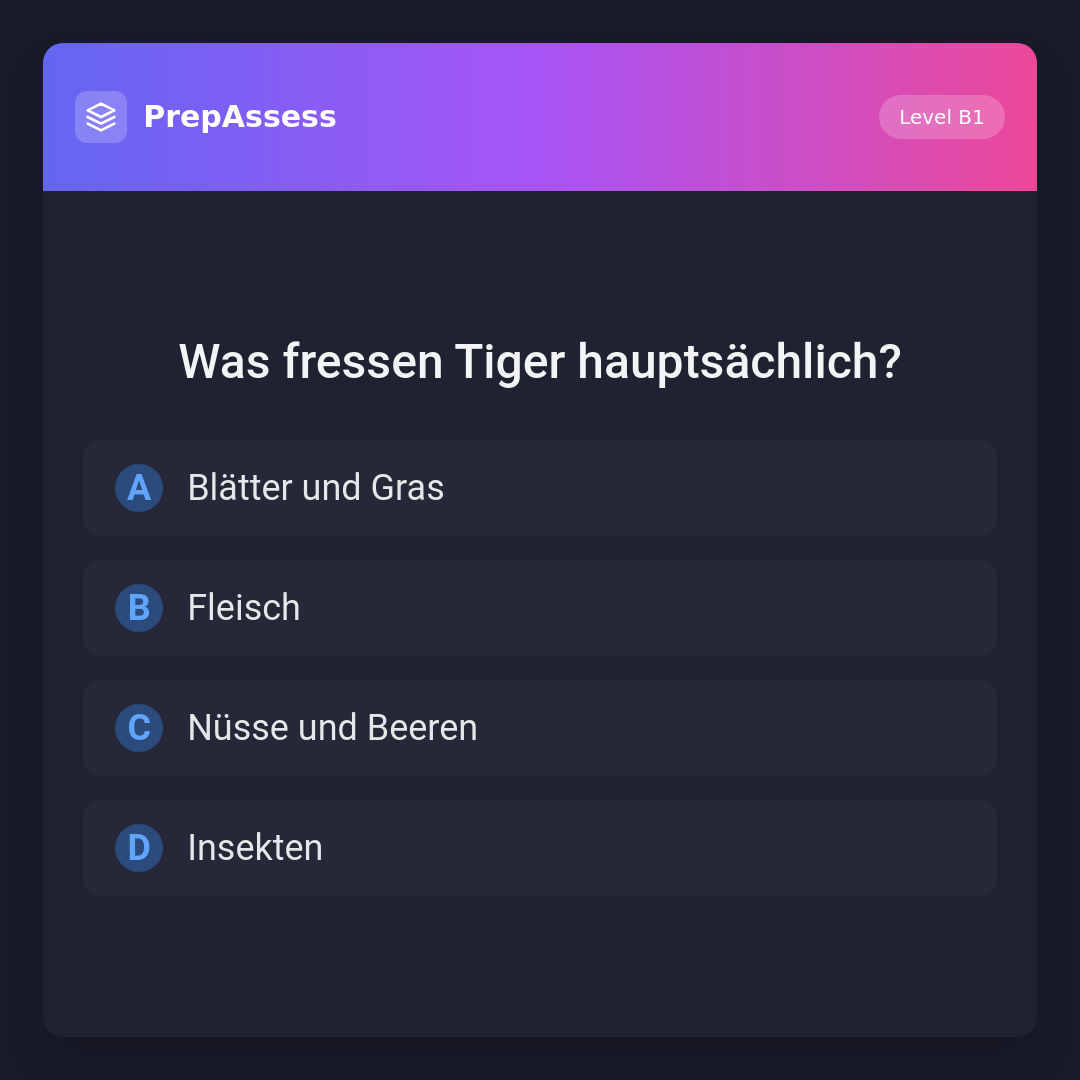 Tiger sind Raubtiere und fressen hauptsächlich Fleisch. Die anderen Optionen beziehen sich auf Ernährungsgewohnheiten von Pflanzenfressern oder Allesfressern.