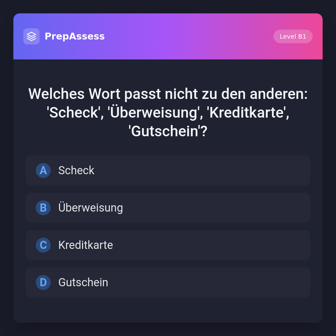 Welches Wort passt nicht zu den anderen: 'Scheck', 'Überweisung', 'Kreditkarte', 'Gutschein'?