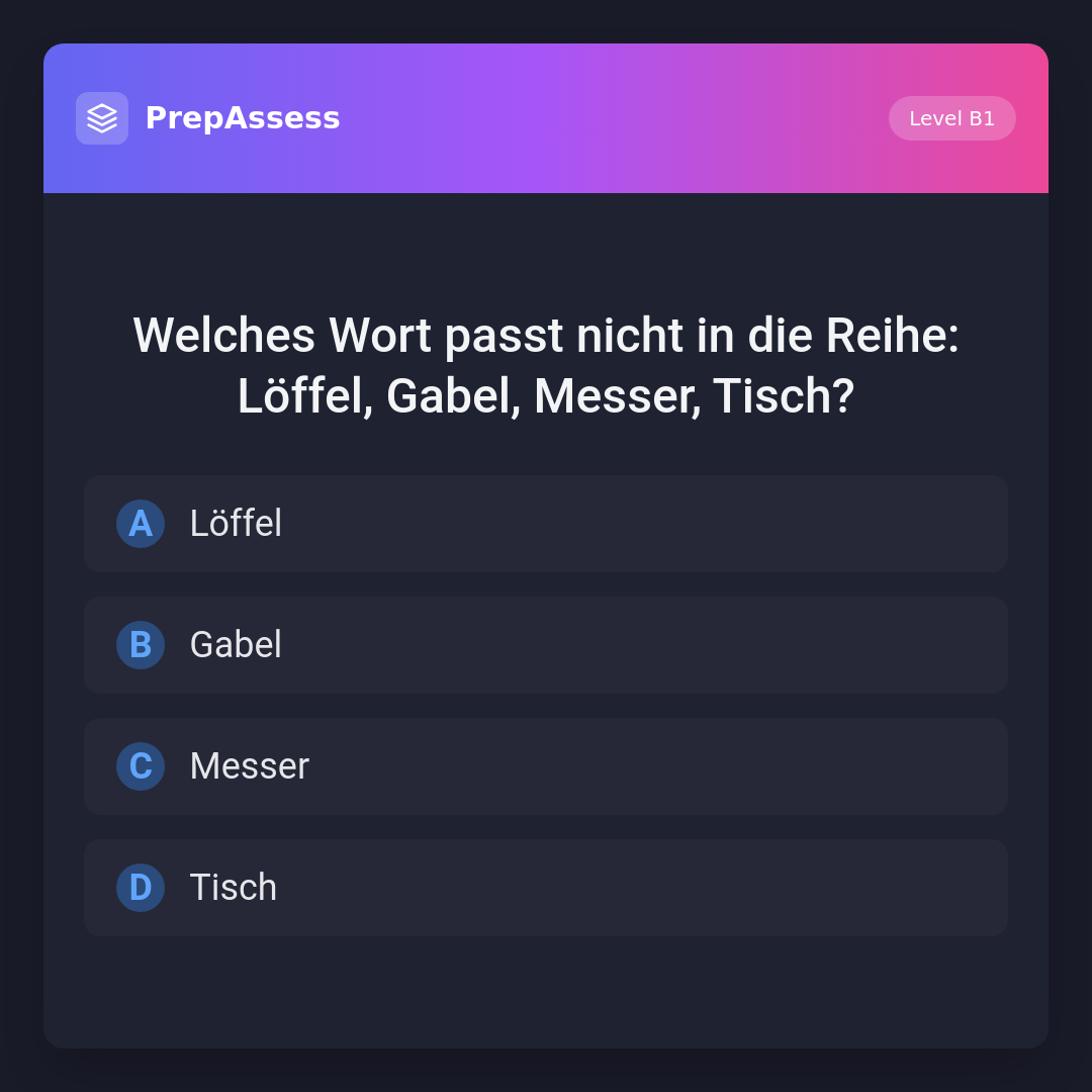 Welches Wort passt nicht in die Reihe: Löffel, Gabel, Messer, Tisch?
