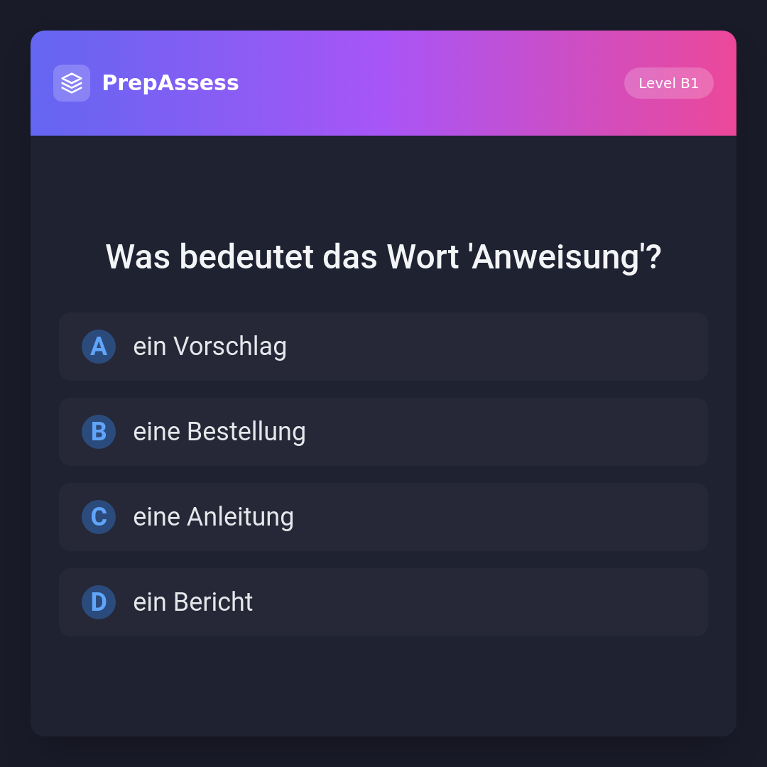 'Anweisung' bedeutet 'eine Anleitung' oder 'Instruktion'. Es handelt sich um eine Erklärung oder Anordnung, wie etwas gemacht werden soll. Ein 'Vorschlag' (a) ist eine Empfehlung, 'eine Bestellung' (b) ist die Aufgabe einer Bestellung und 'ein Bericht' (d) ist eine schriftliche oder mündliche Darstellung von Informationen.