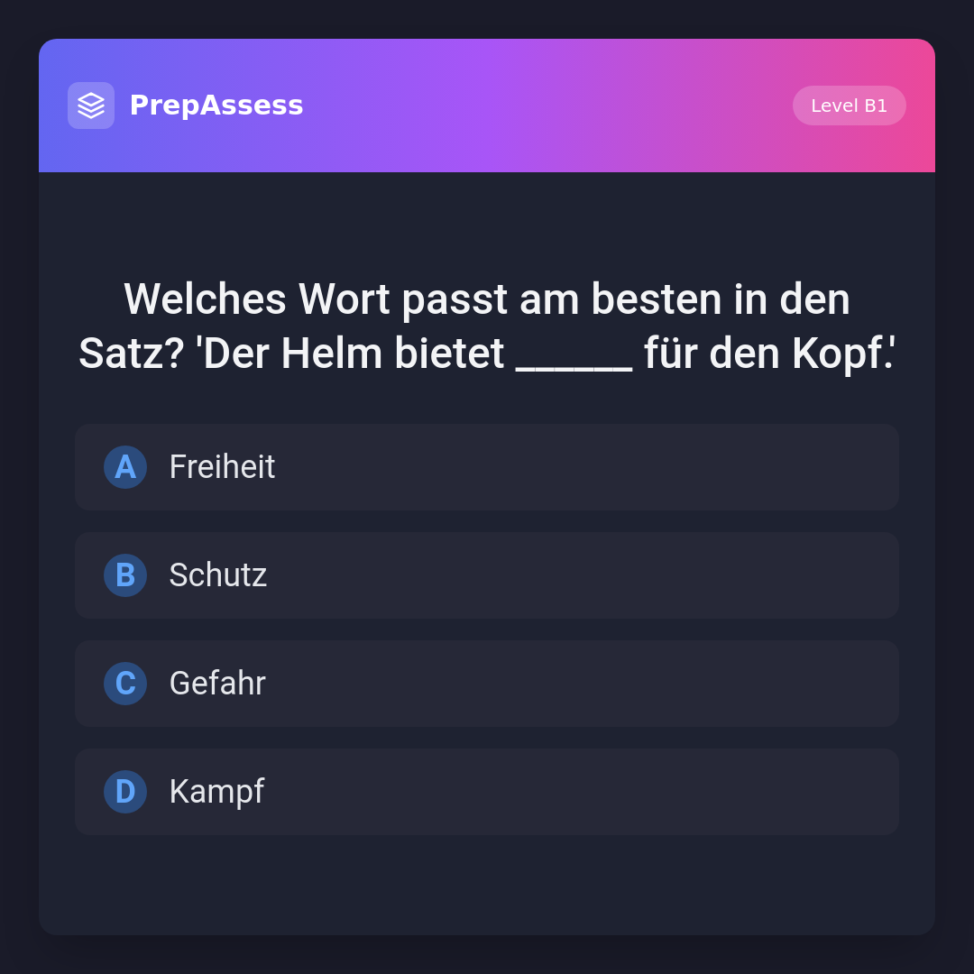 Welches Wort passt am besten in den Satz? 'Der Helm bietet ______ für den Kopf.'