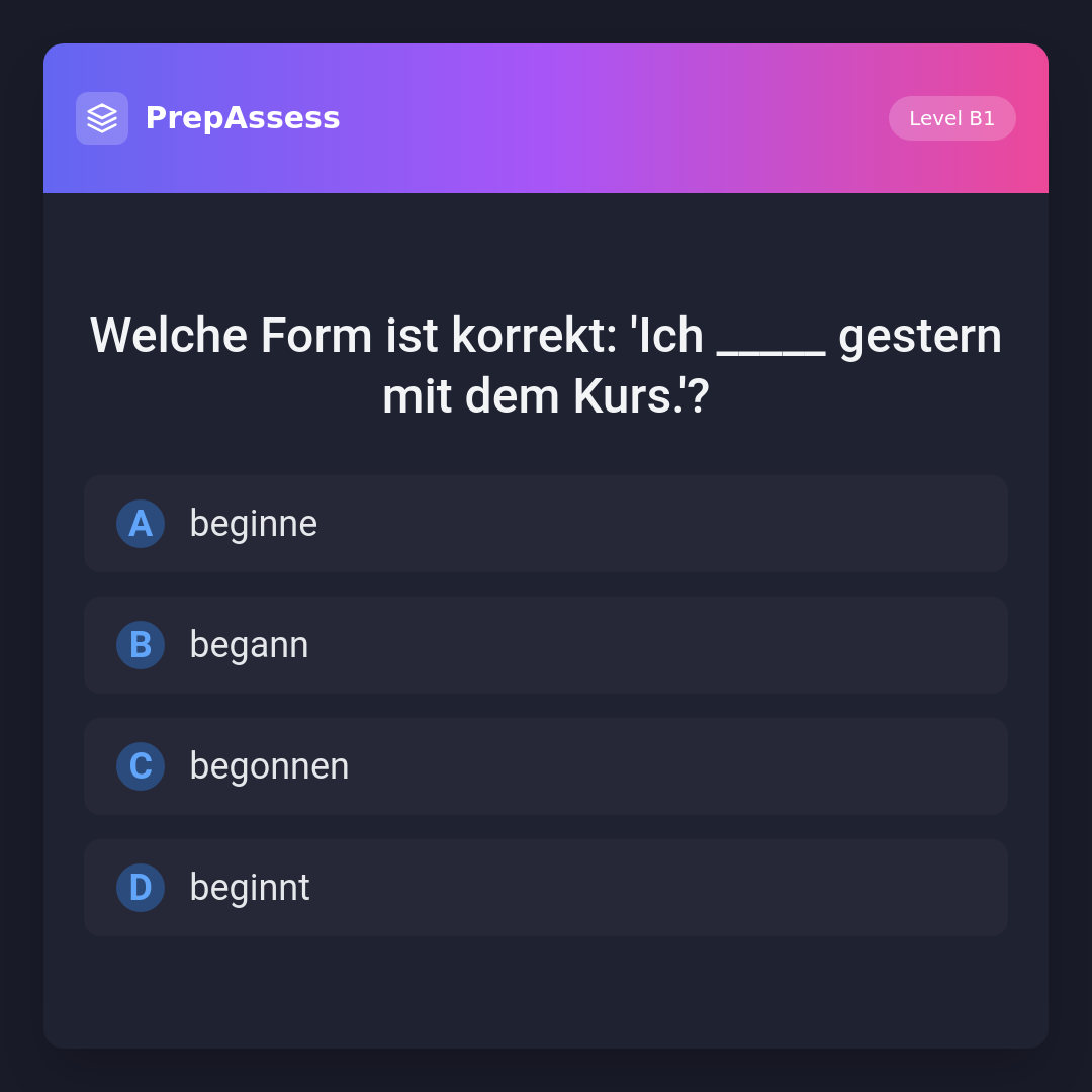 Welche Form ist korrekt: 'Ich _____ gestern mit dem Kurs.'?