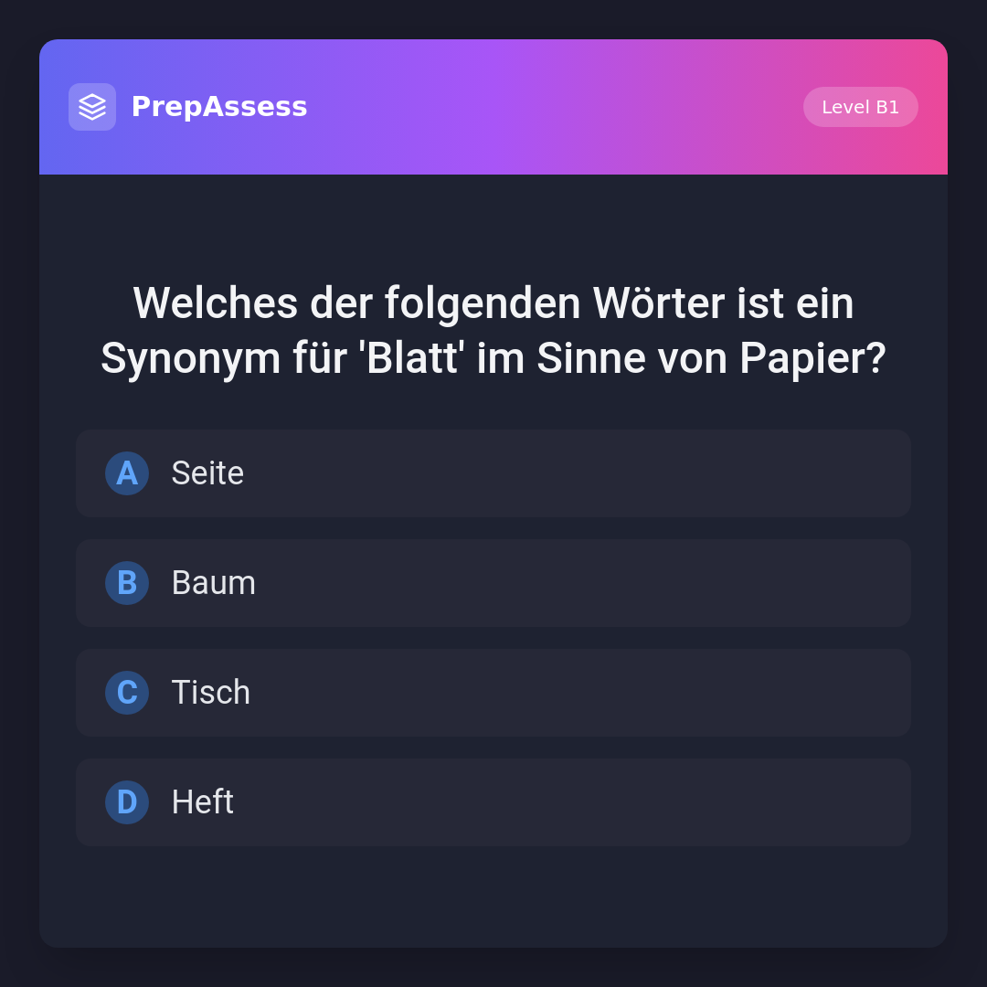 Welches der folgenden Wörter ist ein Synonym für 'Blatt' im Sinne von Papier?