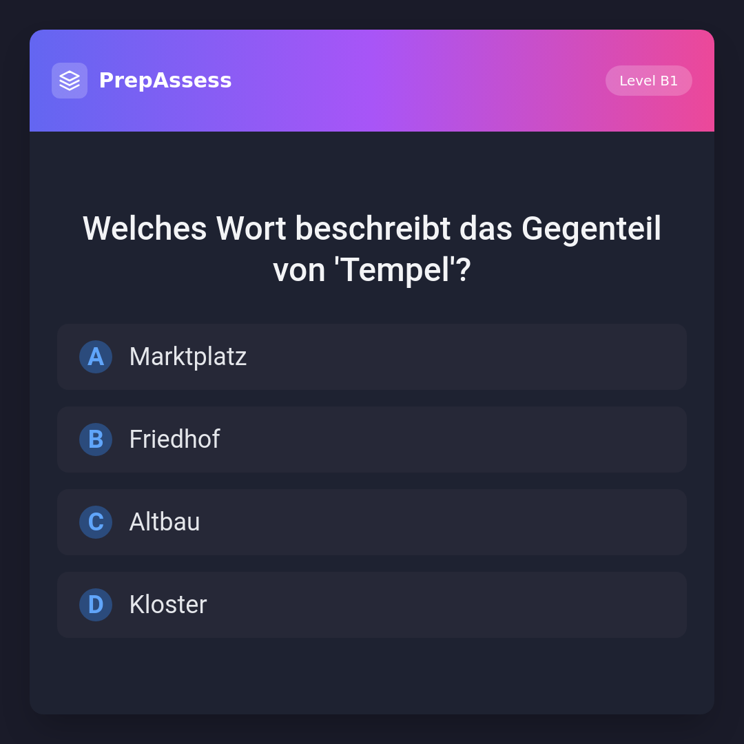Welches Wort beschreibt das Gegenteil von 'Tempel'?