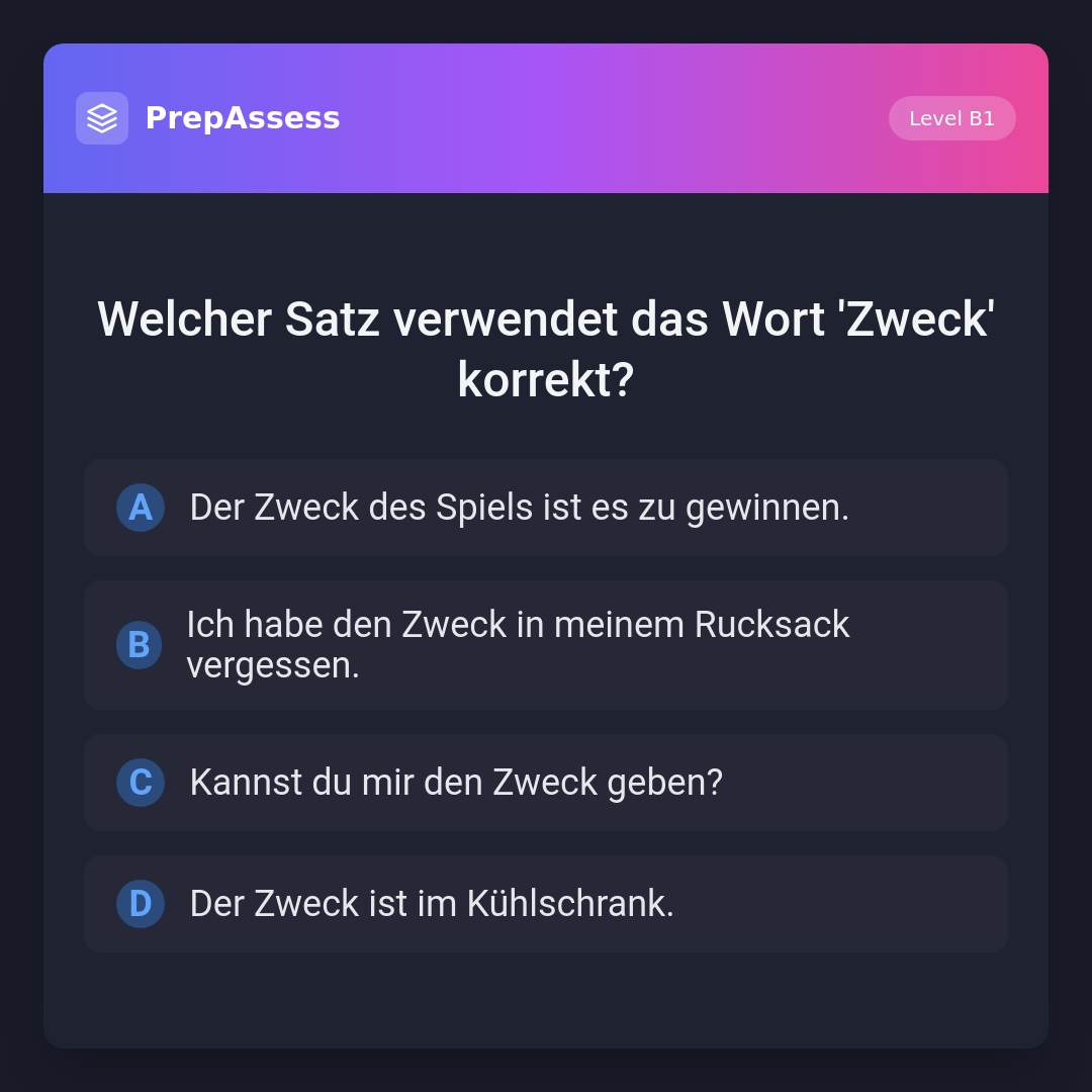 Welcher Satz verwendet das Wort 'Zweck' korrekt?